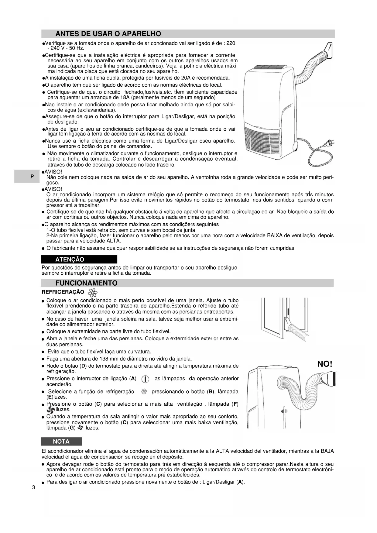 - Não movimento o climatizador durante o的功能amento, desígue ou interruptor e retire a ficha da tomada. Controlar e descarregar a condensação eventual, atraves do tubo de descarga colocado no lado traseiro.