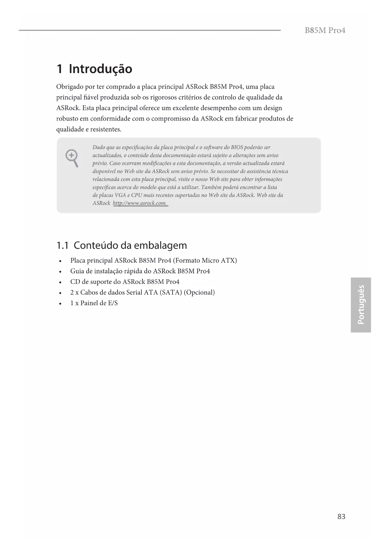 Português 1 Introdução Obrigado por ter comprado a placa principal ASRock B85M Pro4, uma placa principal ável produzida sob os rigorosos critérios de controlo de qualidade da ASRock. Esta placa principal oferece um excelente desempenho com um design robusto em conformidade com o compromisso da ASRock em fabricar produtos de qualidade e resistentes.