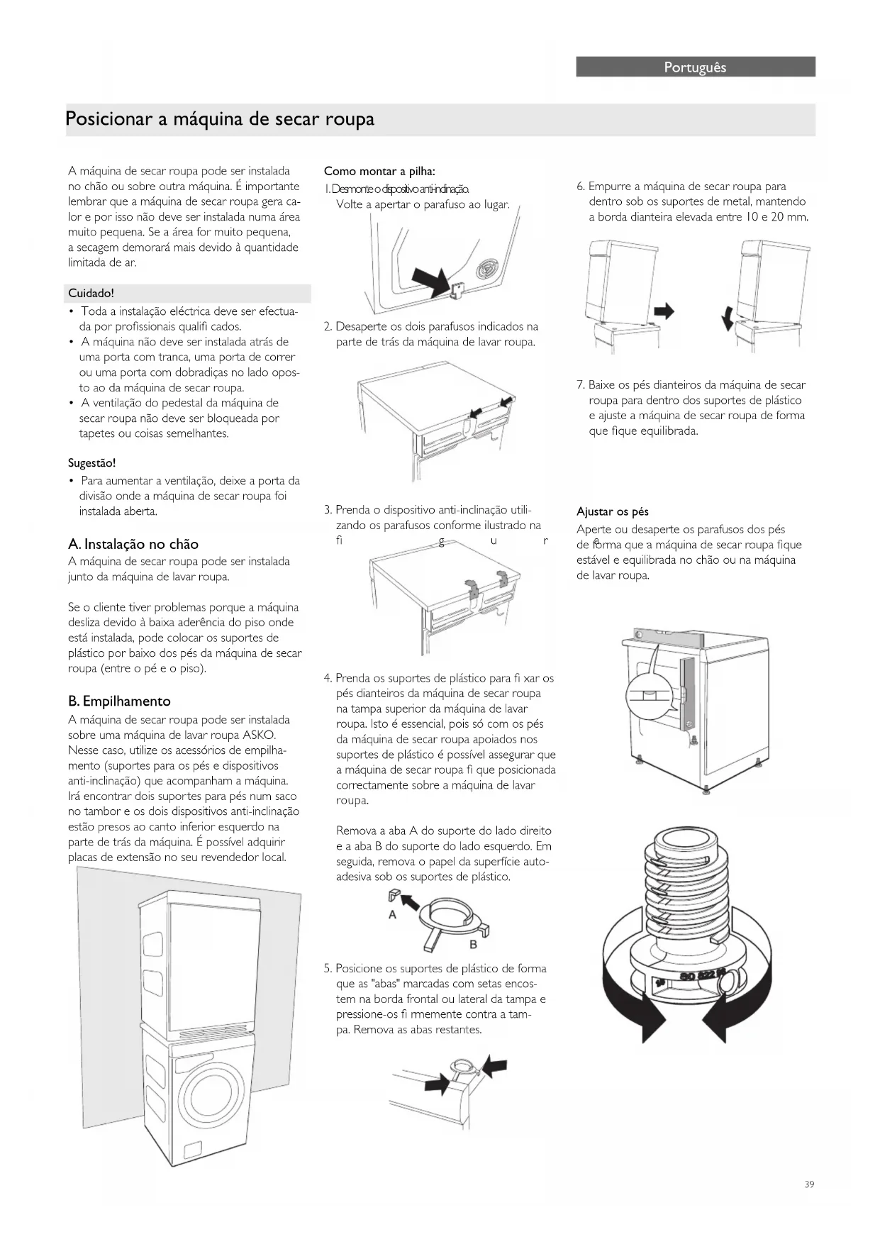 A máquina de secar roupa pode ser instalada no chão ou sobre outra máquina. É importante lembrar que a máquina de secar roupa gera ca- lor e por isso não deve ser instalada numa área muito pequena. Se a área for muito pequena, a secagem demorará mais devido à quantidade limitada de ar. Cuidado!