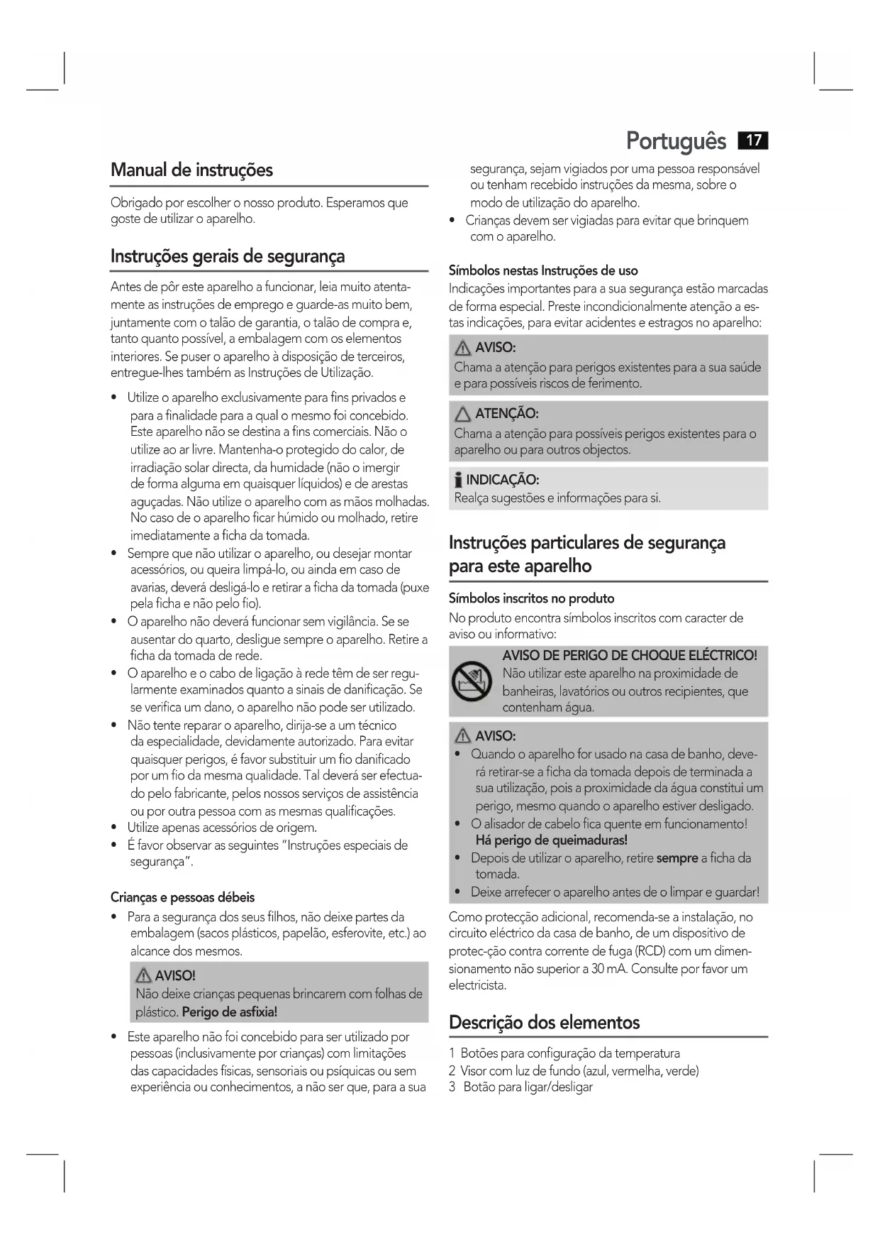 - Deixearrefeceroaparelhoantesdeolimpareguardar! Como protecção adicional, recomenda-se a instalação, no circuito eléctrico da casa de banho, de um dispositivo de protec-ção contra corrente de fuga (RCD) com um dimen- sionamento não superior a 30 mA. Consulte por favor um electricista. Descrição dos elementos 1 Botões para configuração da temperatura 2 Visor com luz de fundo (azul, vermelha, verde) 3 Botão para ligar/desligarPortuguês