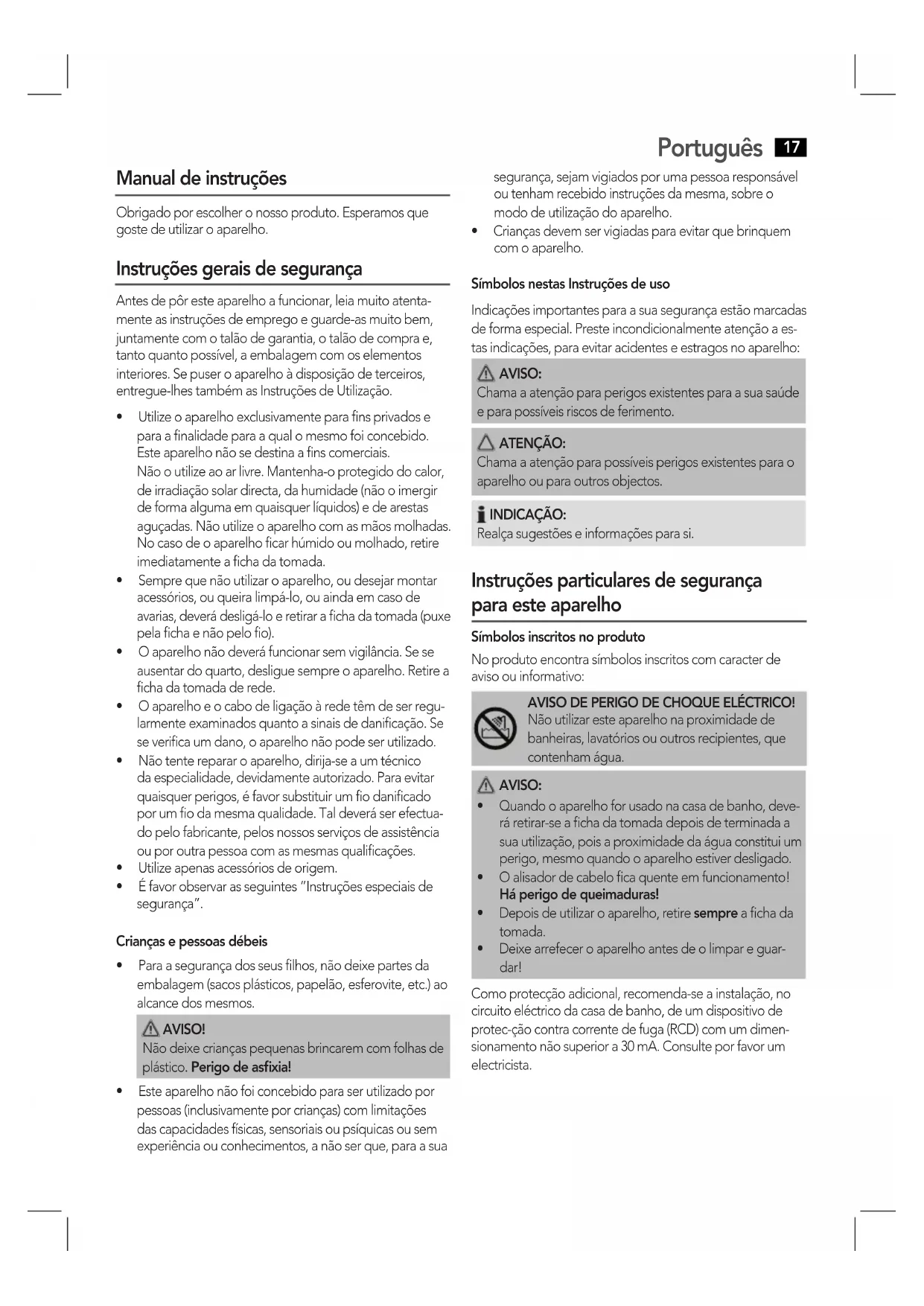 - Criançasdevemservigiadasparaevitarquebrinquem com o aparelho. Símbolos nestas Instruções de uso Indicações importantes para a sua segurança estão marcadas de forma especial. Preste incondicionalmente atenção a es- tas indicações, para evitar acidentes e estragos no aparelho: AVISO: Chama a atenção para perigos existentes para a sua saúde e para possíveis riscos de ferimento. ATENÇÃO: Chama a atenção para possíveis perigos existentes para o aparelho ou para outros objectos. INDICAÇÃO: Realça sugestões e informações para si. Instruções particulares de segurança para este aparelho Símbolos inscritos no produto No produto encontra símbolos inscritos com caracter de aviso ou informativo: AVISO DE PERIGO DE CHOQUE ELÉCTRICO! Não utilizar este aparelho na proximidade de banheiras, lavatórios ou outros recipientes, que contenham água. AVISO: