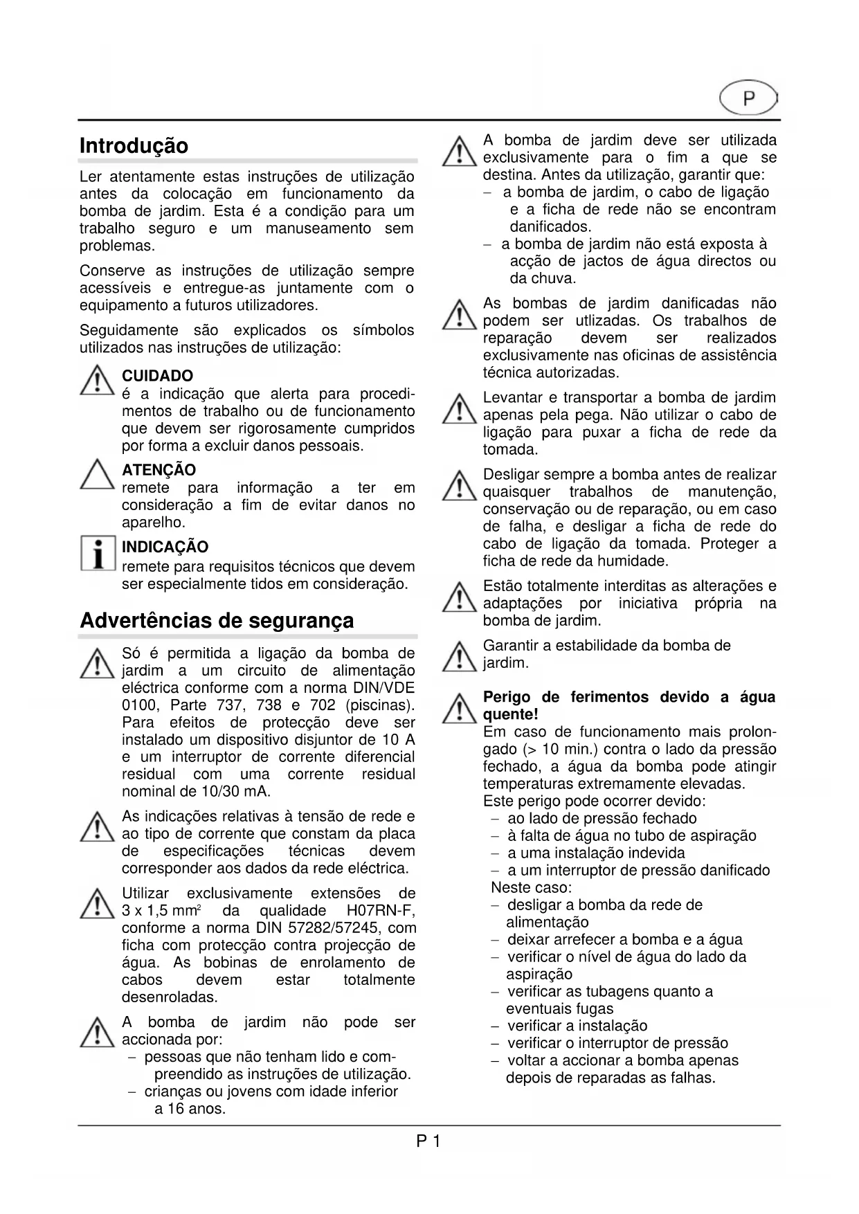 da qualidade H07RN-F, conforme a norma DIN 57282/57245, com ficha com protecção contra projecção de água. As bobinas de enrolamento de cabos devem estar totalmente desenroladas. A bomba de jardim não pode ser accionada por: pessoas que não tenham lido e com- preendido as instruções de utilização. crianças ou jovens com idade inferior a 16 anos. A bomba de jardim deve ser utilizada exclusivamente para o fim a que se destina. Antes da utilização, garantir que: a bomba de jardim, o cabo de ligação e a ficha de rede não se encontram danificados. a bomba de jardim não está exposta à acção de jactos de água directos ou da chuva. As bombas de jardim danificadas não podem ser utlizadas. Os trabalhos de reparação devem ser realizados exclusivamente nas oficinas de assistência técnica autorizadas. Levantar e transportar a bomba de jardim apenas pela pega. Não utilizar o cabo de ligação para puxar a ficha de rede da tomada. Desligar sempre a bomba antes de realizar quaisquer trabalhos de manutenção, conservação ou de reparação, ou em caso de falha, e desligar a ficha de rede do cabo de ligação da tomada. Proteger a ficha de rede da humidade. Estão totalmente interditas as alterações e adaptações por iniciativa própria na bomba de jardim. Garantir a estabilidade da bomba de jardim.