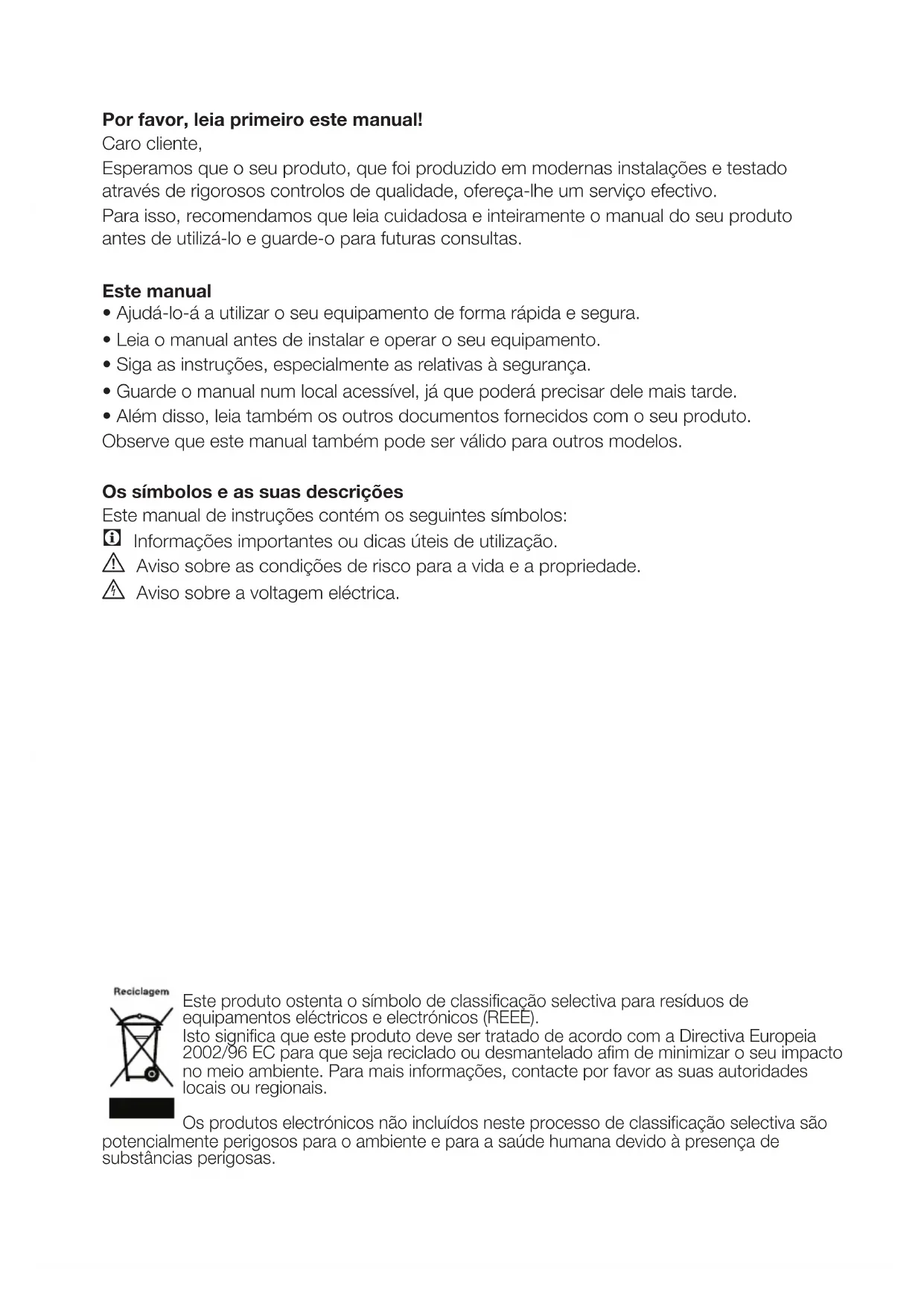Este manual de instruções contém os seguintes símbolos:
