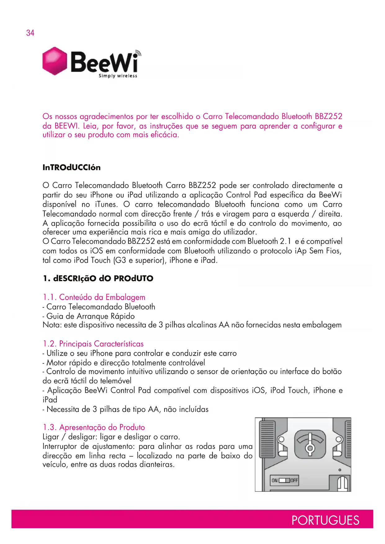 1.1. Conteúdo da Embalagem - Carro Telecomandado Bluetooth - Guia de Arranque Rápido Nota: este dispositivo necessita de 3 pilhas alcalinas AA não fornecidas nesta embalagem 1.2. Principais Características - Utilize o seu iPhone para controlar e conduzir este carro - Motor rápido e direcção totalmente controlável - Controlo de movimento intuitivo utilizando o sensor de orientação ou interface do botão do ecrã táctil do telemóvel - Aplicação BeeWi Control Pad compatível com dispositivos iOS, iPod Touch, iPhone e iPad - Necessita de 3 pilhas de tipo AA, não incluídas 1.3. Apresentação do Produto Ligar / desligar: ligar e desligar o carro. Interruptor de ajustamento: para alinhar as rodas para uma direcção em linha recta – localizado na parte de baixo do veículo, entre as duas rodas dianteiras. Os nossos agradecimentos por ter escolhido o Carro Telecomandado Bluetooth BBZ252 da BEEWI. Leia, por favor, as instruções que se seguem para aprender a configurar e utilizar o seu produto com mais eficácia.35 PORTUGUES 1.4. Especificações do Produto