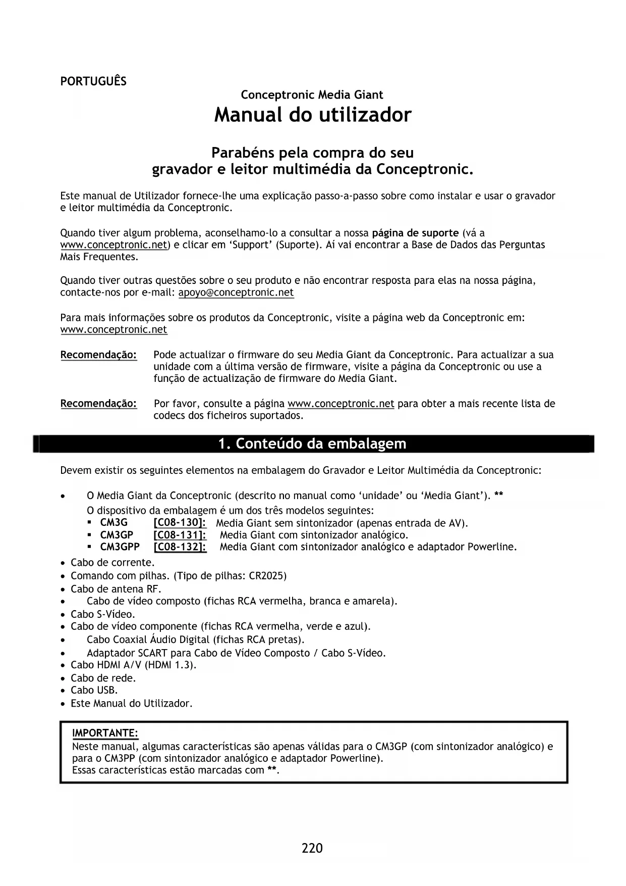 Neste manual, algumas caractéricas são apenas validas para o CM3GP (com sintonizador analógico) e para o CM3PP (com sintonizador analogico e adaptor Powerline).