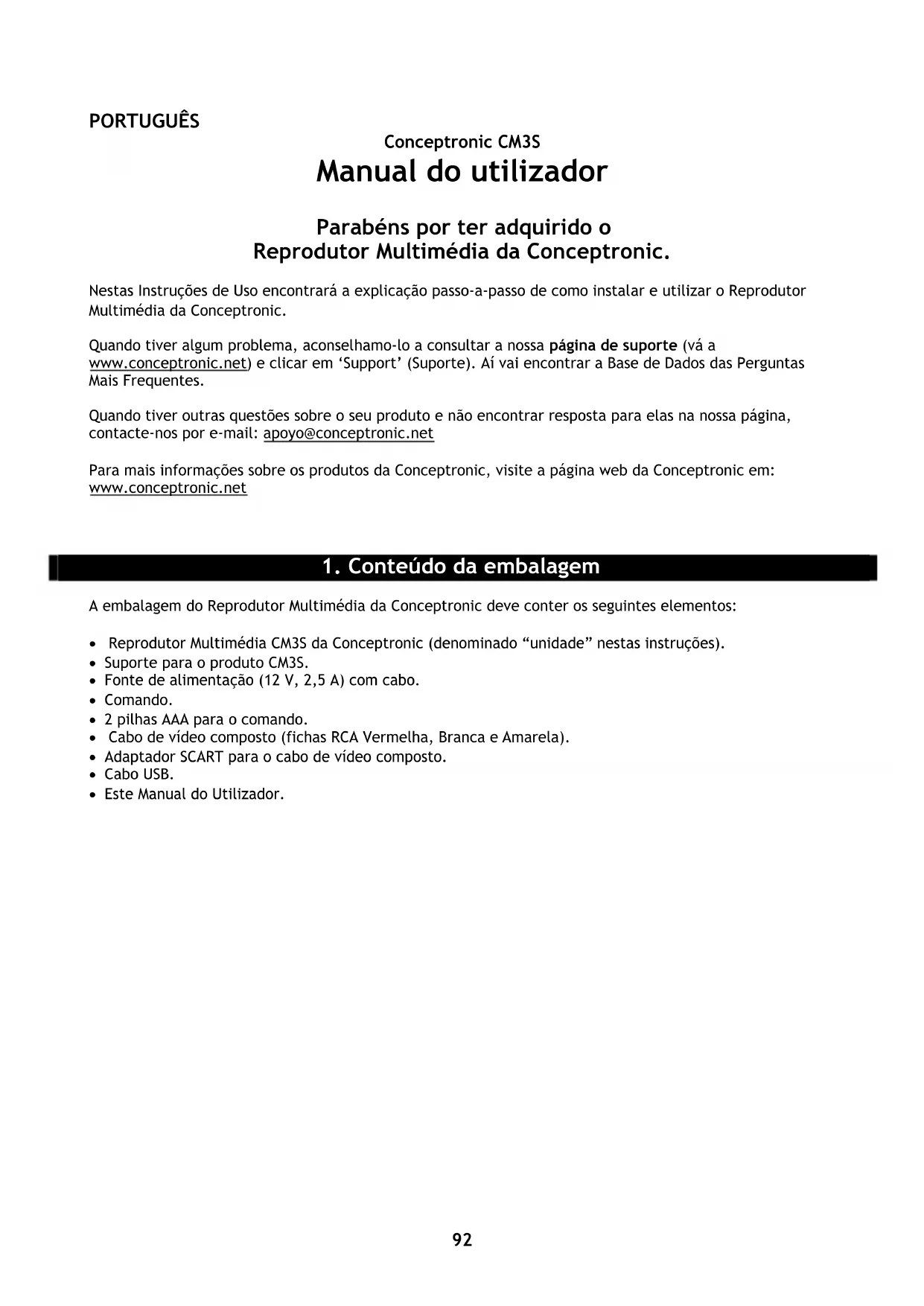 A embalagem do Reprodutor Multimédia da Conceptronic deve conter os seguintes elementos: