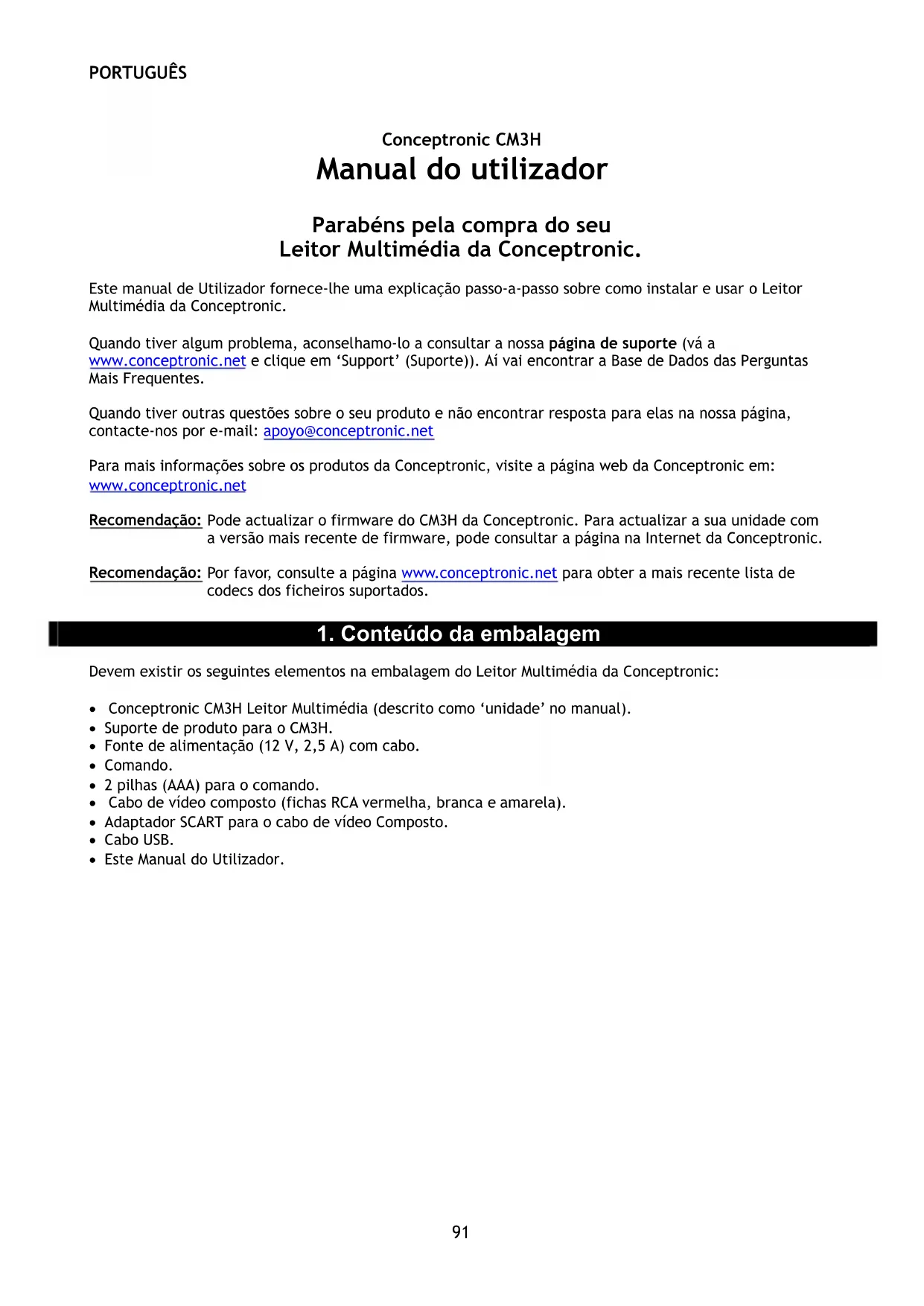 • Conceptronic CM3H Leitor Multimédia (descrito como ‘unidade’ no manual). • Suporte de produto para o CM3H. • Fonte de alimentação (12 V, 2,5 A) com cabo. • Comando. • 2 pilhas (AAA) para o comando. • Cabo de vídeo composto (fichas RCA vermelha, branca e amarela). • Adaptador SCART para o cabo de vídeo Composto. • Cabo USB. • Este Manual do Utilizador.PORTUGUÊS