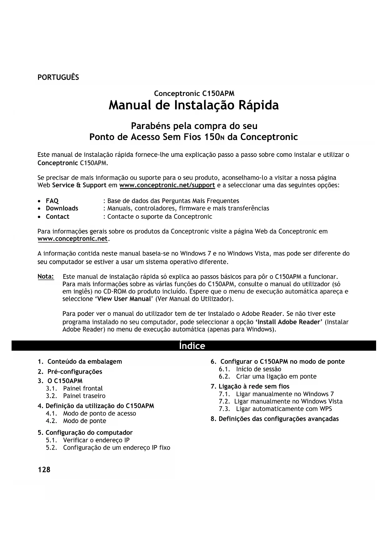 Este manual de instalação rápida fornece-lhe uma explicação passo a passo sobre como instalar e'utilizar o Conceptronico C150APM.