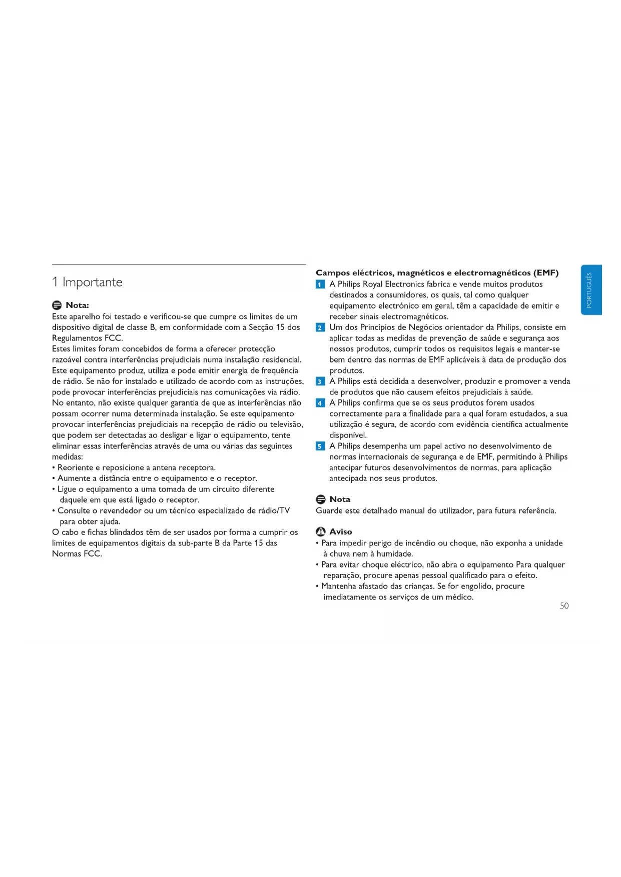 - Consulte o revendedor ou um técnico especializado de rádio/TV para obter ajuda. O cabo e fichas blindados têm de ser usados por forma a cumprir os limites de equipamentos digitais da sub-parte B da Parte 15 das Normas FCC. Campos eléctricos, magnéticos e electromagnéticos (EMF) A Philips Royal Electronics fabrica e vende muitos produtos destinados a consumidores, os quais, tal como qualquer equipamento electrónico em geral, têm a capacidade de emitir e receber sinais electromagnéticos. Um dos Princípios de Negócios orientador da Philips, consiste em aplicar todas as medidas de prevenção de saúde e segurança aos nossos produtos, cumprir todos os requisitos legais e manter-se bem dentro das normas de EMF aplicáveis à data de produção dos produtos. A Philips está decidida a desenvolver, produzir e promover a venda de produtos que não causem efeitos prejudiciais à saúde. A Philips confirma que se os seus produtos forem usados correctamente para a finalidade para a qual foram estudados, a sua utilização é segura, de acordo com evidência científica actualmente disponível. A Philips desempenha um papel activo no desenvolvimento de normas internacionais de segurança e de EMF, permitindo à Philips antecipar futuros desenvolvimentos de normas, para aplicação antecipada nos seus produtos. Nota Guarde este detalhado manual do utilizador, para futura referência. Aviso