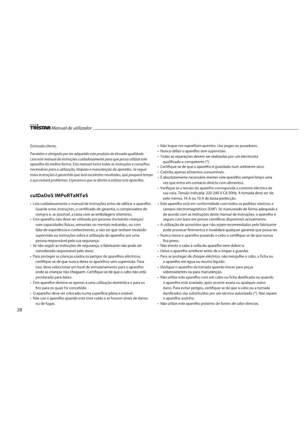 - Danos causados pelo não seguito do manual de instruções anularão a garantia e se isso resultar em danos consequentes, a Tristar não sera responsavel.