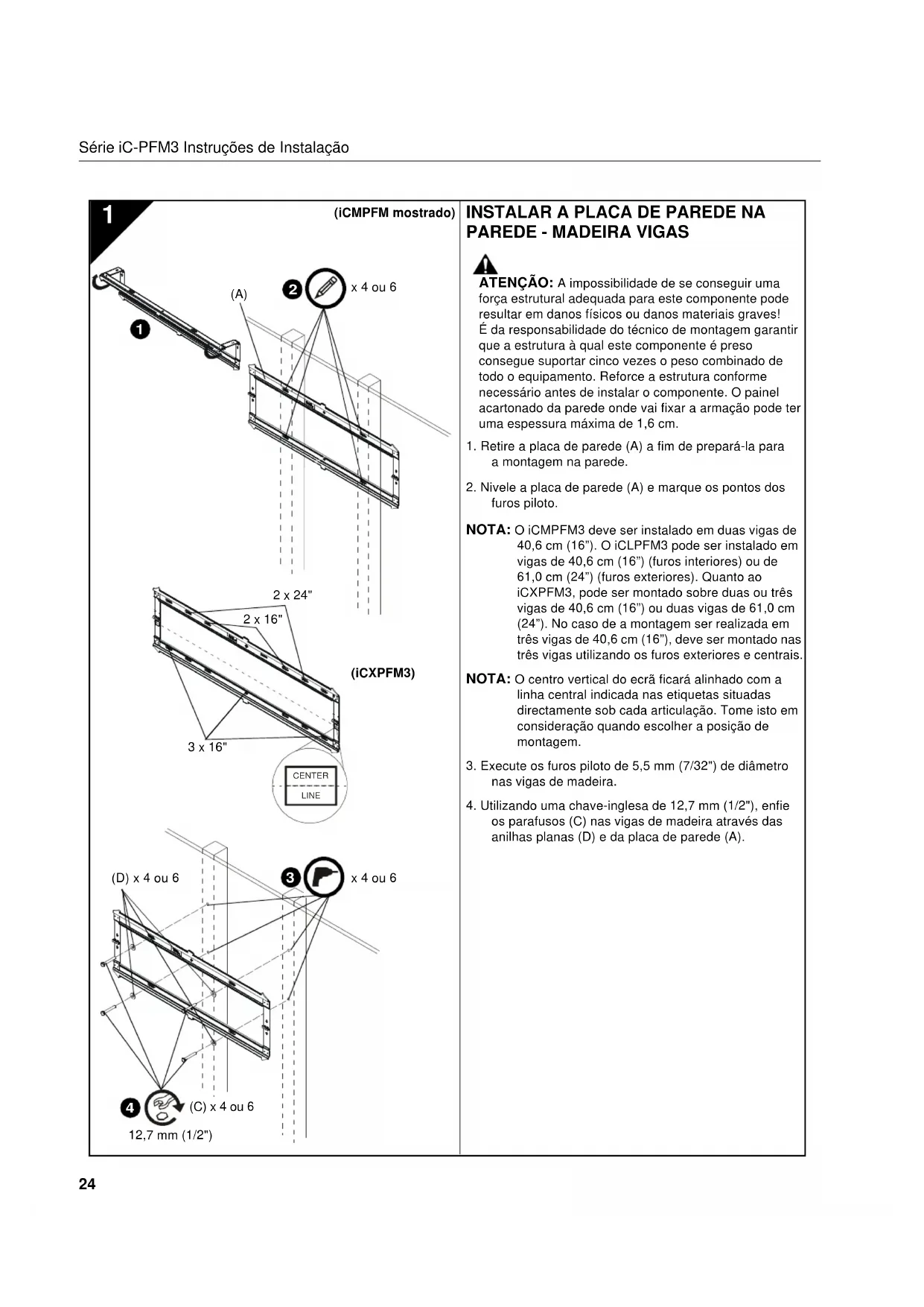 x 4 ou 6 (C) x 4 ou 6 (D) x 4 ou 6 x 4 ou 6 2 x 24" 2 x 16" (iCXPFM3) 3 x 16"Instruções de Instalação Série iC-PFM3
