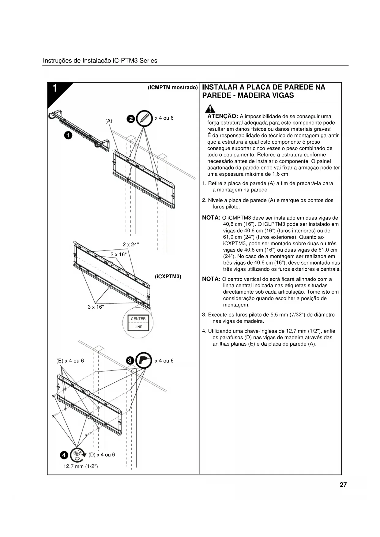 OU NA ANULAÇÃO DA GARANTIA DE FÁBRICA. É da responsabilidade do técnico de instalação garantir que todos os componentes são devidamente montados e instalados segundo as instruções fornecidas. ATENÇÃO: A impossibilidade de se conseguir uma resistência estrutural adequada para este componente pode resultar em danos físicos ou danos materiais graves! É da responsabilidade do técnico de montagem garantir que a estrutura à qual este componente é preso consegue suportar cinco vezes o peso combinado de todo o equipamento. Reforçar a estrutura conforme necessário antes de se instalar o componente. O painel acartonado da parede onde se vai fixar a armação pode ter uma espessura máxima de 15,9 mm. ATENÇÃO: Exceder a capacidade de peso pode resultar em danos físicos ou danos materiais graves! É da responsabilidade do técnico de instalação garantir que o peso combinado de todos os componentes não excede 56,7 kg (125 libras) para os iCMPTM3 e iCLPTM3 ou 79,4 kg (175 libras) para o iCXPTM3.A utilização com produtos acima do peso máximo indicado pode levar à queda da armação e dos respectivos acessórios, daí resultando possíveis ferimentos. AVVERTENZE e PRECAUZIONI IMPORTANTI! AVVERTENZA: Un'AVVERTENZA mette in guardia in merito alla possibilità di gravi infortuni, anche letali, qualora non si osservino le istruzioni. ATTENZIONE: Un'ATTENZIONE indica la possibilità di gravi danni all'attrezzatura qualora non ci si attiene alle istruzioni al riguardo. AVVERTENZA: La mancata comprensione e ottemperanza alle istruzioni fornite può provocare gravi lesioni personali, danni all'apparecchiatura o invalidare la garanzia fornita dal produttore. Spetta all'installatore verificare che tutti i componenti siano assemblati correttamente e installati secondo le istruzioni fornite. AVVERTENZA: Una resistenza strutturale inadeguata per questo componente può arrecare gravi lesioni personali o danni all'unità! L'installatore ha la responsabilità di accertare che la struttura su cui questo componente viene montato sia in grado di sostenere cinque volte il peso totale dell'intera unità. Rinforzare la struttura, se necessario, prima d'installare il componente. La parete del montaggio può essere ricoperta da un cartongesso di uno spessore massimo di 15,9 mm (5/8 poll.).iC-PTM3 Series Installation Instructions