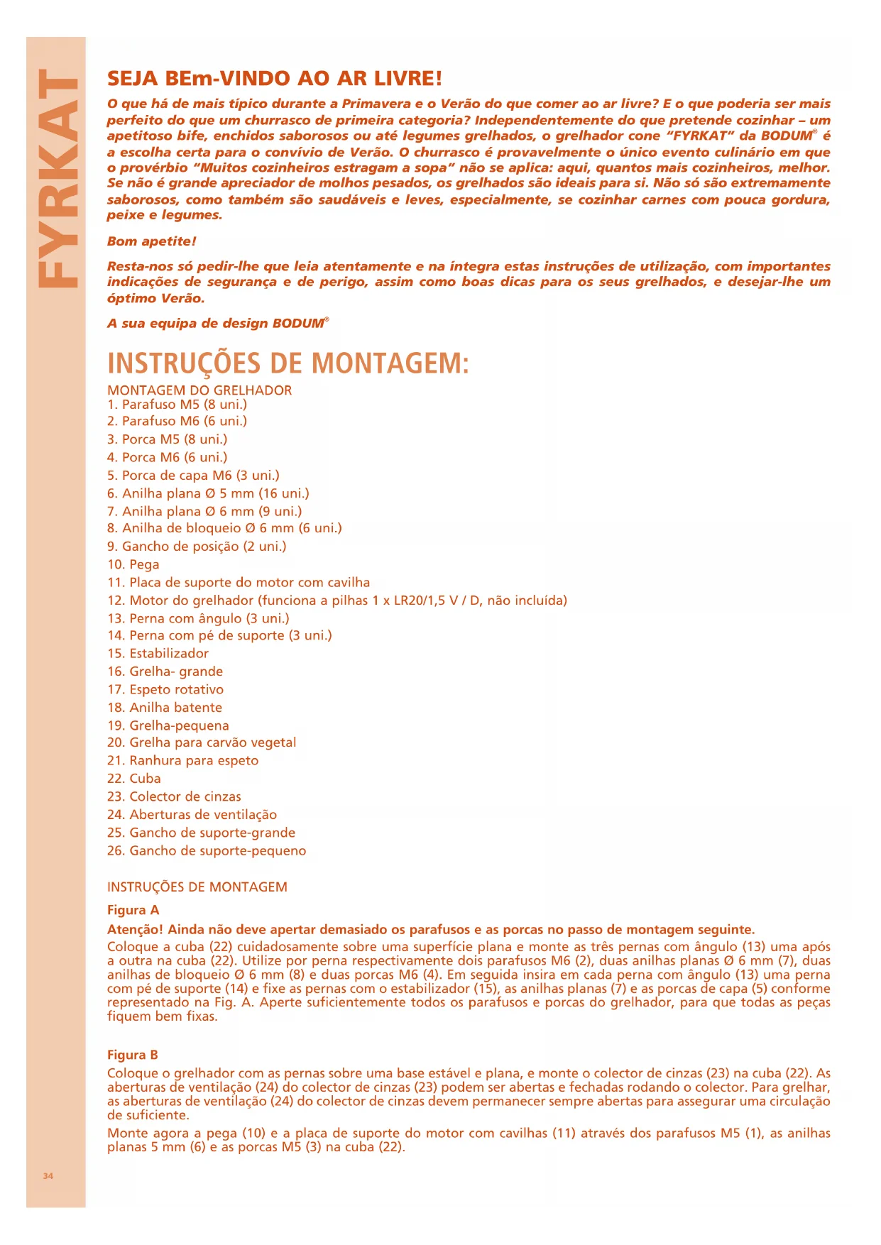 Figura A Atenção! Ainda não deve apertar demasiado os parafusos e as porcas no passo de montagem seguinte. Coloque a cuba (22) cuidadosamente sobre uma superfície plana e monte as três pernas com ângulo (13) uma após a outra na cuba (22). Utilize por perna respectivamente dois parafusos M6 (2), duas anilhas planas Ø 6 mm (7), duas anilhas de bloqueio Ø 6 mm (8) e duas porcas M6 (4). Em seguida insira em cada perna com ângulo (13) uma perna com pé de suporte (14) e fixe as pernas com o estabilizador (15), as anilhas planas (7) e as porcas de capa (5) conforme representado na Fig. A. Aperte suficientemente todos os parafusos e porcas do grelhador, para que todas as peças fiquem bem fixas. Figura B Coloque o grelhador com as pernas sobre uma base estável e plana, e monte o colector de cinzas (23) na cuba (22). As aberturas de ventilação (24) do colector de cinzas (23) podem ser abertas e fechadas rodando o colector. Para grelhar, as aberturas de ventilação (24) do colector de cinzas devem permanecer sempre abertas para assegurar uma circulação de suficiente. Monte agora a pega (10) e a placa de suporte do motor com cavilhas (11) através dos parafusos M5 (1), as anilhas planas 5 mm (6) e as porcas M5 (3) na cuba (22).mANUAL DE INSTRUÇÕES