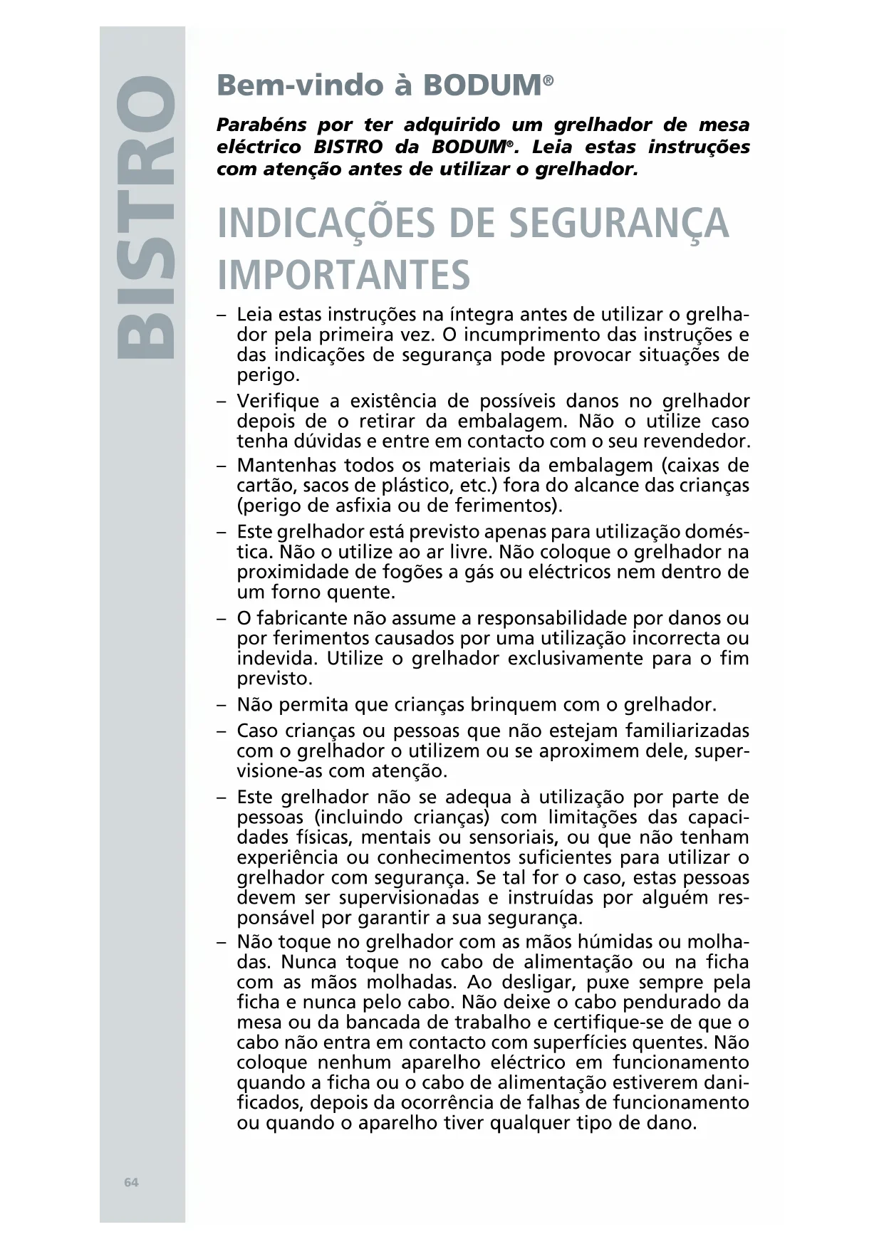 Parabéns por ter adquirido um grelhador de mesa eléctrico BISTRO da BODUM. Leia estas instruções com atençao antes de utilizes o grelhador.