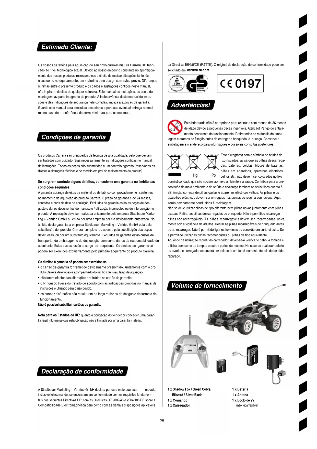 - os danos / disfunções não resultarem de força maior ou de desgaste decorrente do funcionamento. Não é possível substituir cartões de garantia. Nota para os Estados da UE: quanto à obrigação do vendedor conceder uma garan- tia legal informa-se que esta obrigação não é limitada por uma garantia material. Declaração de conformidade A Stadlbauer Marketing + Vertrieb GmbH declara por este meio que este modelo, inclusive telecomando, se encontram em conformidade com os requisitos fundamen- tais das seguintes Directivas CE: com as Directivas CE 2009/48 e 2004/108/CE sobre a Compatibilidade Electromagnética bem como com as demais disposições aplicáveis da Directiva 1999/5/CE (R&TTE). O original da declaração de conformidade pode ser solicitado em carrerarc.com Advertências! Este brinquedo não é apropriado para crianças com menos de 36 meses de idade devido a pequenas peças ingeríveis. Atenção! Perigo de entala- mento decorrente do funcionamento! Retire todos os materiais de emba- lagem e arames de xação antes de entregar o brinquedo à criança. Conserve a embalagem e o endereço para informações e possíveis consultas posteriores. Este pictograma com o símbolo de baldes de lixo riscados, avisa que as pilhas descarrega- das, baterias, células, blocos de baterias, pilhas em aparelhos, aparelhos eléctricos velhos etc., não devem ser colocados no lixo doméstico, dado que são nocivos ao meio ambiente e à saúde. Contribua para a pre- servação do meio ambiente e da saúde e esclareça também os seus lhos quanto à eliminação correcta de pilhas gastas e aparelhos eléctricos velhos. As pilhas e os aparelhos eléctricos devem ser entregues nos pontos de recolha conhecidos. Aqui, serão devidamente conduzidos à reciclagem. Não se deve utilizar pilhas de tipo diferente nem pilhas novas juntamente com pilhas usadas. Retirar as pilhas descarregadas do brinquedo. Não é permitido recarregar pilhas não-recarregáveis. As pilhas recarregáveis devem ser recarregadas unica- mente sob a vigilância de adultos. Retirar as pilhas recarregáveis do brinquedo antes de as recarregar. Não é permitido ligar os terminais de conexão em curto-circuito. Só é permitido utilizar as pilhas recomendadas ou pilhas de tipo equivalente. Aquando da utilização regular do carregador, dever-se-á vericar o cabo, a tomada e a cha bem como as tampas e outras partes do mesmo. No caso de qualquer defeito ou avaria, o carregador só deverá ser colocado em funcionamento depois de ter sido reparado. Volume de fornecimento 1 x Bateria 1 x Antena 1 x Boclo de 9V (não recarregável) 1 x Shadow Fox / Green Cobra Blizzard / Silver Blade 1 x Comando 1 x Carregador1