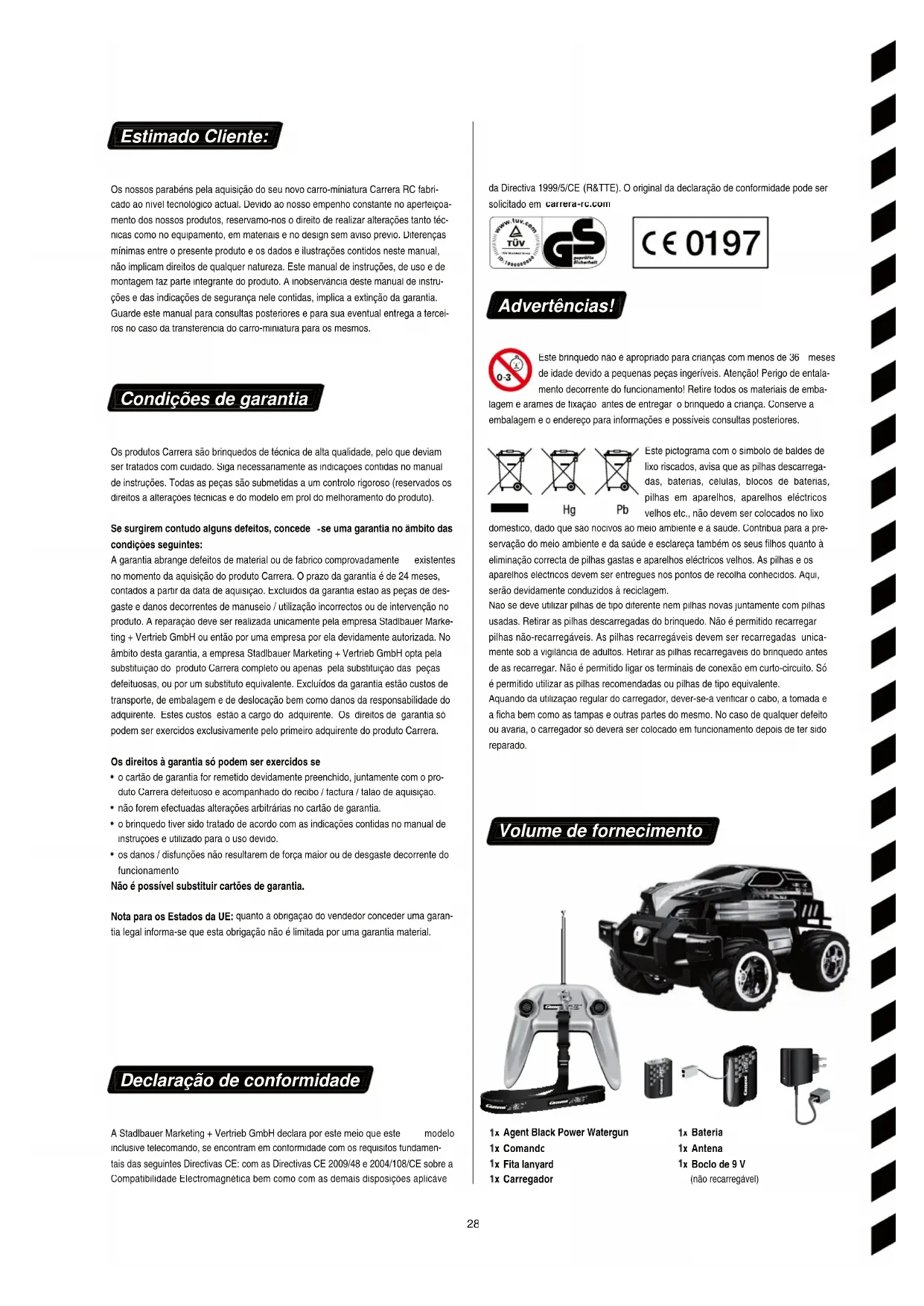 se uma garantia no âmbito das condições seguintes: A garantia abrange defeitos de material ou de fabrico comprovadamente existentes no momento da aquisição do produto Carrera. O prazo da garantia é de 24 meses, contados a partir da data de aquisição. Excluídos da garantia estão as peças de des- gaste e danos decorrentes de manuseio / utilização incorrectos ou de intervenção no produto. A reparação deve ser realizada unicamente pela empresa Stadlbauer Marke- ting + Vertrieb GmbH ou então por uma empresa por ela devidamente autorizada. No âmbito desta garantia, a empresa Stadlbauer Marketing + Vertrieb GmbH opta pela substituição do produto Carrera completo ou apenas pela substituição das peças defeituosas, ou por um substituto equivalente. Excluídos da garantia estão custos de transporte, de embalagem e de deslocação bem como danos da responsabilidade do adquirente. Estes custos estão a cargo do adquirente. Os direitos de garantia só podem ser exercidos exclusivamente pelo primeiro adquirente do produto Carrera. Os direitos à garantia só podem ser exercidos se