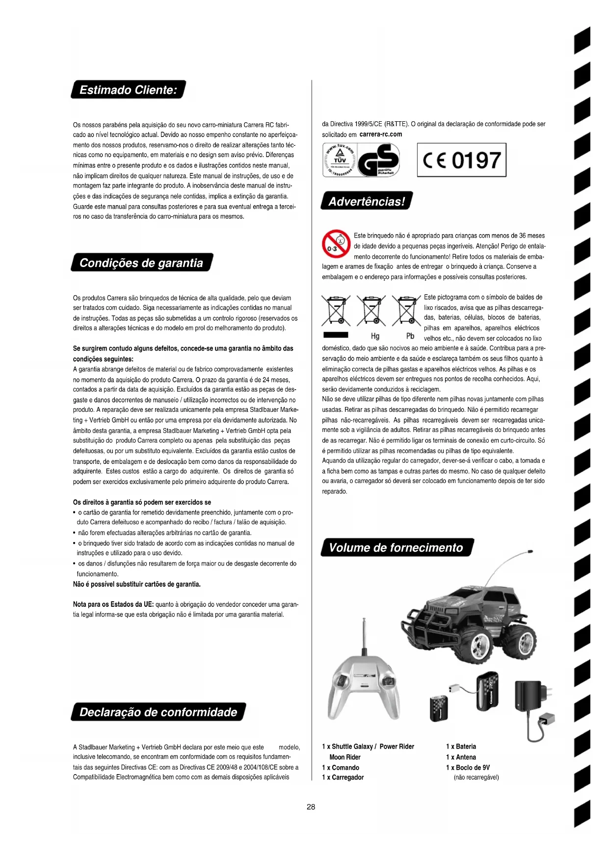 - os danos / disfunções não resultarem de força maior ou de desgaste decorrente do funcionamento. Não é possível substituir cartões de garantia. Nota para os Estados da UE: quanto à obrigação do vendedor conceder uma garan- tia legal informa-se que esta obrigação não é limitada por uma garantia material. Declaração de conformidade A Stadlbauer Marketing + Vertrieb GmbH declara por este meio que este modelo, inclusive telecomando, se encontram em conformidade com os requisitos fundamen- tais das seguintes Directivas CE: com as Directivas CE 2009/48 e 2004/108/CE sobre a Compatibilidade Electromagnética bem como com as demais disposições aplicáveis da Directiva 1999/5/CE (R&TTE). O original da declaração de conformidade pode ser solicitado em carrerarc.com Advertências! Este brinquedo não é apropriado para crianças com menos de 36 meses de idade devido a pequenas peças ingeríveis. Atenção! Perigo de entala- mento decorrente do funcionamento! Retire todos os materiais de emba- lagem e arames de xação antes de entregar o brinquedo à criança. Conserve a embalagem e o endereço para informações e possíveis consultas posteriores. Este pictograma com o símbolo de baldes de lixo riscados, avisa que as pilhas descarrega- das, baterias, células, blocos de baterias, pilhas em aparelhos, aparelhos eléctricos velhos etc., não devem ser colocados no lixo doméstico, dado que são nocivos ao meio ambiente e à saúde. Contribua para a pre- servação do meio ambiente e da saúde e esclareça também os seus lhos quanto à eliminação correcta de pilhas gastas e aparelhos eléctricos velhos. As pilhas e os aparelhos eléctricos devem ser entregues nos pontos de recolha conhecidos. Aqui, serão devidamente conduzidos à reciclagem. Não se deve utilizar pilhas de tipo diferente nem pilhas novas juntamente com pilhas usadas. Retirar as pilhas descarregadas do brinquedo. Não é permitido recarregar pilhas não-recarregáveis. As pilhas recarregáveis devem ser recarregadas unica- mente sob a vigilância de adultos. Retirar as pilhas recarregáveis do brinquedo antes de as recarregar. Não é permitido ligar os terminais de conexão em curto-circuito. Só é permitido utilizar as pilhas recomendadas ou pilhas de tipo equivalente. Aquando da utilização regular do carregador, dever-se-á vericar o cabo, a tomada e a cha bem como as tampas e outras partes do mesmo. No caso de qualquer defeito ou avaria, o carregador só deverá ser colocado em funcionamento depois de ter sido reparado. Volume de fornecimento 1 x Bateria 1 x Antena 1 x Boclo de 9V (não recarregável) 1 x Shuttle Galaxy / Power Rider Moon Rider 1 x Comando 1 x Carregador1