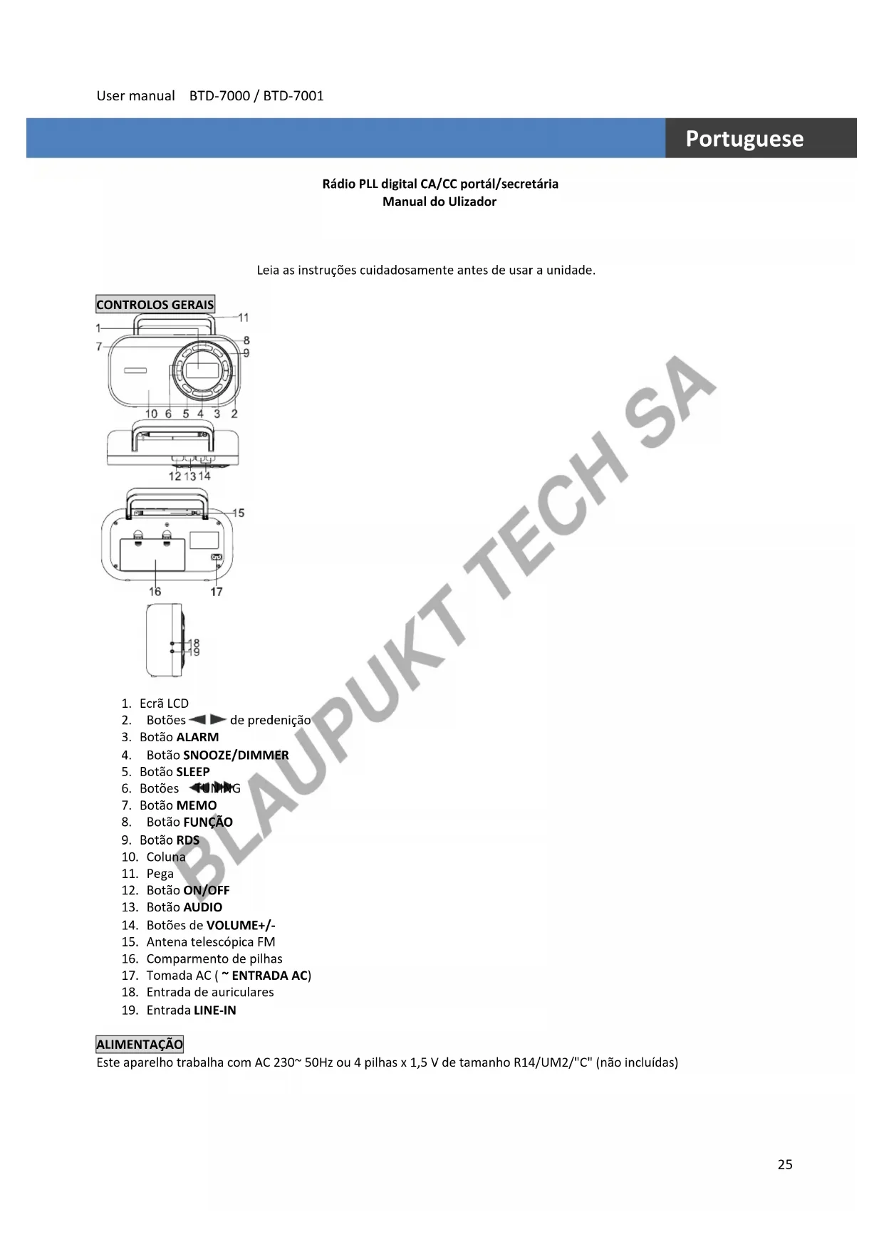 19. Entrada LINE-IN ALIMENTAÇÃO Este aparelho trabalha com AC 230~ 50Hz ou 4 pilhas x 1,5 V de tamanho R14/UM2/"C" (não incluídas)