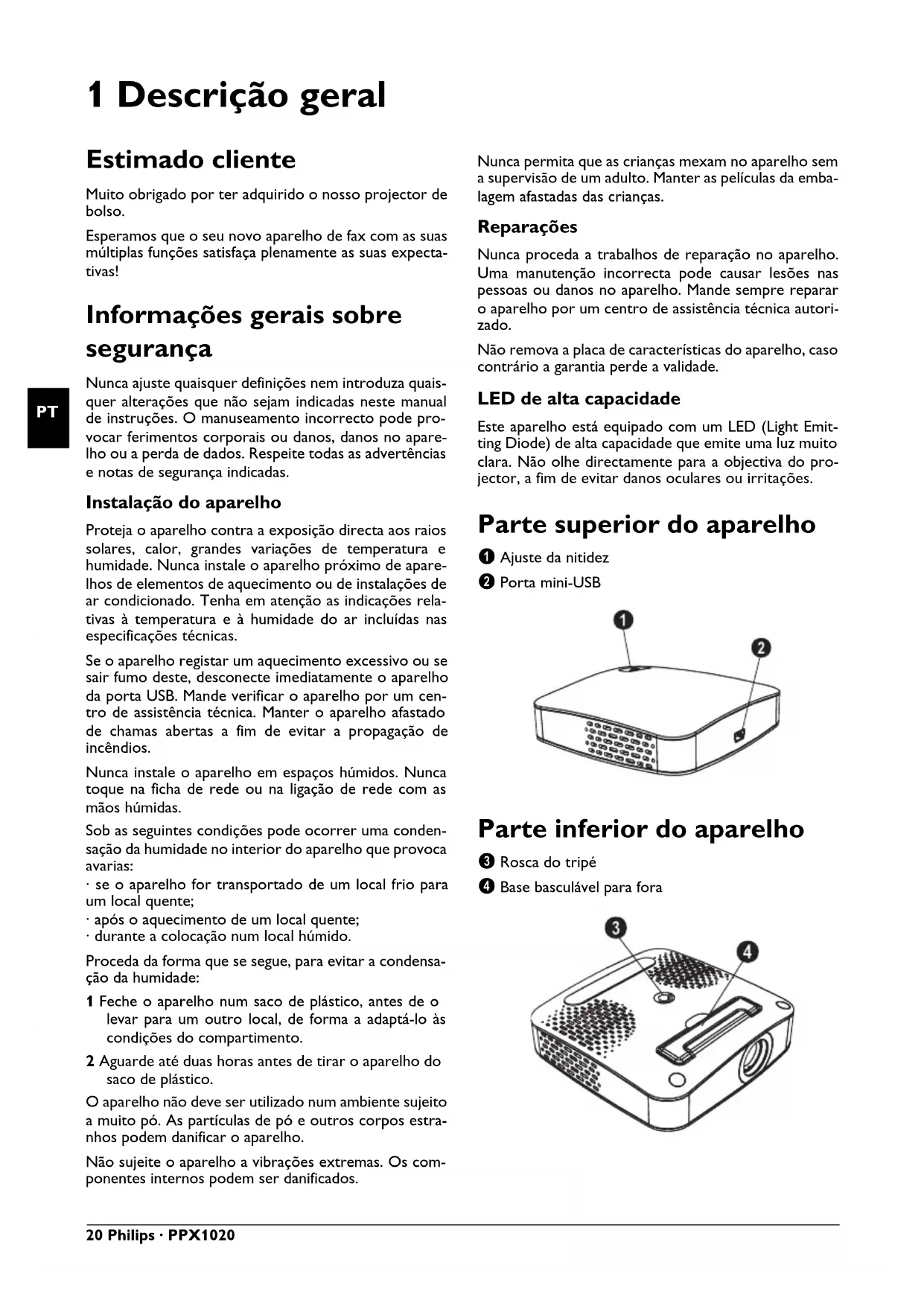 - durante a colocação num local húmido. Proceda da forma que se segue, para evitar a condensa- ção da humidade: 1 Feche o aparelho num saco de plástico, antes de o levar para um outro local, de forma a adaptá-lo às condições do compartimento. 2 Aguarde até duas horas antes de tirar o aparelho do saco de plástico. O aparelho não deve ser utilizado num ambiente sujeito a muito pó. O aparelho não deve ser utilizado num ambiente sujeito a muito pó. As partículas de pó e outros corpos estra- nhos podem danificar o aparelho. Não sujeite o aparelho a vibrações extremas. Não sujeite o aparelho a vibrações extremas. Os com- ponentes internos podem ser danificados. Nunca permita que as crianças mexam no aparelho sem a supervisão de um adulto. Nunca permita que as crianças mexam no aparelho sem a supervisão de um adulto. Manter as películas da emba- lagem afastadas das crianças. Reparações Reparações Nunca proceda a trabalhos de reparação no aparelho. Uma manutenção incorrecta pode causar lesões nas pessoas ou danos no aparelho. Mande sempre reparar o aparelho por um centro de assistência técnica autori- zado. Não remova a placa de características do aparelho, caso contrário a garantia perde a validade. LED de alta capacidade Este aparelho está equipado com um LED (Light Emit- ting Diode) de alta capacidade que emite uma luz muito clara. Não olhe directamente para a objectiva do pro- jector, a fim de evitar danos oculares ou irritações. Parte superior do aparelho ‚ Ajuste da nitidez ƒ Porta mini-USB PicoPix P1 oben Parte inferior do aparelho „ Rosca do tripé … Base basculável para fora PicoPix P1 unten ppx1020_manual_07_pt_253345797-b.book Seite 20 Freitag, 17. September 2010 11:52 11Funcionamento básico 21