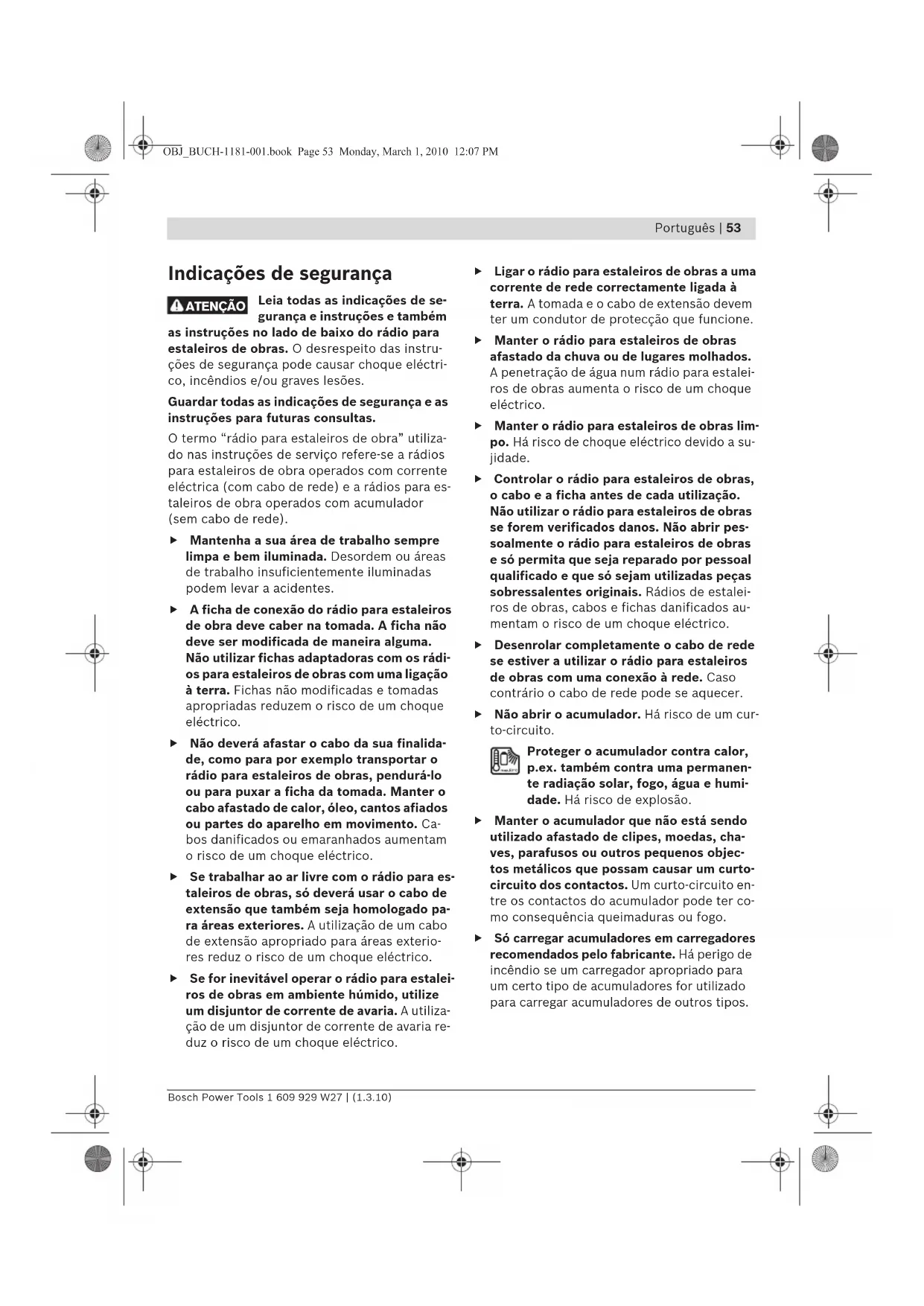 Indicações de segurança Leia todas as indicações de se- gurança e instruções e também as instruções no lado de baixo do rádio para estaleiros de obras. O desrespeito das instru- ções de segurança pode causar choque eléctri- co, incêndios e/ou graves lesões. Guardar todas as indicações de segurança e as instruções para futuras consultas. O termo “rádio para estaleiros de obra” utiliza- do nas instruções de serviço refere-se a rádios para estaleiros de obra operados com corrente eléctrica (com cabo de rede) e a rádios para es- taleiros de obra operados com acumulador (sem cabo de rede). f Mantenha a sua área de trabalho sempre limpa e bem iluminada. Desordem ou áreas de trabalho insuficientemente iluminadas podem levar a acidentes. f A ficha de conexão do rádio para estaleiros de obra deve caber na tomada. A ficha não deve ser modificada de maneira alguma. Não utilizar fichas adaptadoras com os rádi- os para estaleiros de obras com uma ligação à terra. Fichas não modificadas e tomadas apropriadas reduzem o risco de um choque eléctrico. f Não deverá afastar o cabo da sua finalida- de, como para por exemplo transportar o rádio para estaleiros de obras, pendurá-lo ou para puxar a ficha da tomada. Manter o cabo afastado de calor, óleo, cantos afiados ou partes do aparelho em movimento. Ca- bos danificados ou emaranhados aumentam o risco de um choque eléctrico. f Se trabalhar ao ar livre com o rádio para es- taleiros de obras, só deverá usar o cabo de extensão que também seja homologado pa- ra áreas exteriores. A utilização de um cabo de extensão apropriado para áreas exterio- res reduz o risco de um choque eléctrico. f Se for inevitável operar o rádio para estalei- ros de obras em ambiente húmido, utilize um disjuntor de corrente de avaria. A utiliza- ção de um disjuntor de corrente de avaria re- duz o risco de um choque eléctrico. f Ligar o rádio para estaleiros de obras a uma corrente de rede correctamente ligada à terra. A tomada e o cabo de extensão devem ter um condutor de protecção que funcione. f Manter o rádio para estaleiros de obras afastado da chuva ou de lugares molhados. A penetração de água num rádio para estalei- ros de obras aumenta o risco de um choque eléctrico. f Manter o rádio para estaleiros de obras lim- po. Há risco de choque eléctrico devido a su- jidade. f Controlar o rádio para estaleiros de obras, o cabo e a ficha antes de cada utilização. Não utilizar o rádio para estaleiros de obras se forem verificados danos. Não abrir pes- soalmente o rádio para estaleiros de obras e só permita que seja reparado por pessoal qualificado e que só sejam utilizadas peças sobressalentes originais. Rádios de estalei- ros de obras, cabos e fichas danificados au- mentam o risco de um choque eléctrico. f Desenrolar completamente o cabo de rede se estiver a utilizar o rádio para estaleiros de obras com uma conexão à rede. Caso contrário o cabo de rede pode se aquecer. f Não abrir o acumulador. Há risco de um cur- to-circuito. Proteger o acumulador contra calor, p.ex. também contra uma permanen- te radiação solar, fogo, água e humi- dade. Há risco de explosão. f Manter o acumulador que não está sendo utilizado afastado de clipes, moedas, cha- ves, parafusos ou outros pequenos objec- tos metálicos que possam causar um curto- circuito dos contactos. Um curto-circuito en- tre os contactos do acumulador pode ter co- mo consequência queimaduras ou fogo. f Só carregar acumuladores em carregadores recomendados pelo fabricante. Há perigo de incêndio se um carregador apropriado para um certo tipo de acumuladores for utilizado para carregar acumuladores de outros tipos. ATENÇÃO OBJ_BUCH-1181-001.book Page 53 Monday, March 1, 2010 12:07 PM54 | Português 1 609 929 W27 | (1.3.10) Bosch Power Tools f Só utilizar o acumulador junto com o seu rá- dio para estaleiros de obras e/ou com uma ferramenta eléctrica Bosch. Só assim é que o seu acumulador é protegido contra perigo- sa sobrecarga. f Só devem ser utilizados acumuladores de iões de lítio originais Bosch com uma ten- são de 14,4 V ou 18 V. Se forem usados ou- tros acumuladores, p.ex. imitações, acumu- ladores restaurados ou acumuladores de outras marcas, há perigo de lesões, assim co- mo danos materiais devido a explosões de acumuladores. f Em ferramentas eléctricas, com fichas de rede ou dispositivos de encaixe que servem de dispositivo de separação, é necessário que o dispositivo de separação possa ser utilizado sem dificuldades. f Leia e observe estritamente as indicações de segurança e de trabalho das instruções de serviço dos aparellhos aos quais conec- tar o rádio para estaleiros de obras. Descrição de funções Devem ser lidas todas as indicações de advertência e todas as instru- ções. O desrespeito das advertênci- as e instruções apresentadas abaixo pode causar choque eléctrico, incên- dio e/ou graves lesões. Dados técnicos Rádio para estaleiros de obras GML 20 Professional N° do produto 3 601 D29 7.. Baterias tampão 2 x 1,5 V (LR06/AA) Acumulador 14,4–18 V Temperatura de funcionamento °C 0...45 Temperatura de armazenamento °C –20...+70 Peso conforme EPTA- Procedure 01/2003 kg 10,2 Classe de protecção /I Tipo de protecção IP 54 (protegi- do contra pó e salpicos de água) Funcionamento Audio/Rádio Tensão de funciona- mento – no funcionamento ligado à rede – no funcionamento com acumulador