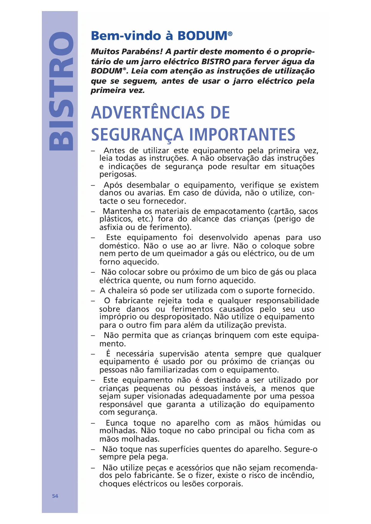 Muitos Parabéns! A partir deste momento é o proprie- tário de um jarro eléctrico BISTRO para ferver água da BODUM
