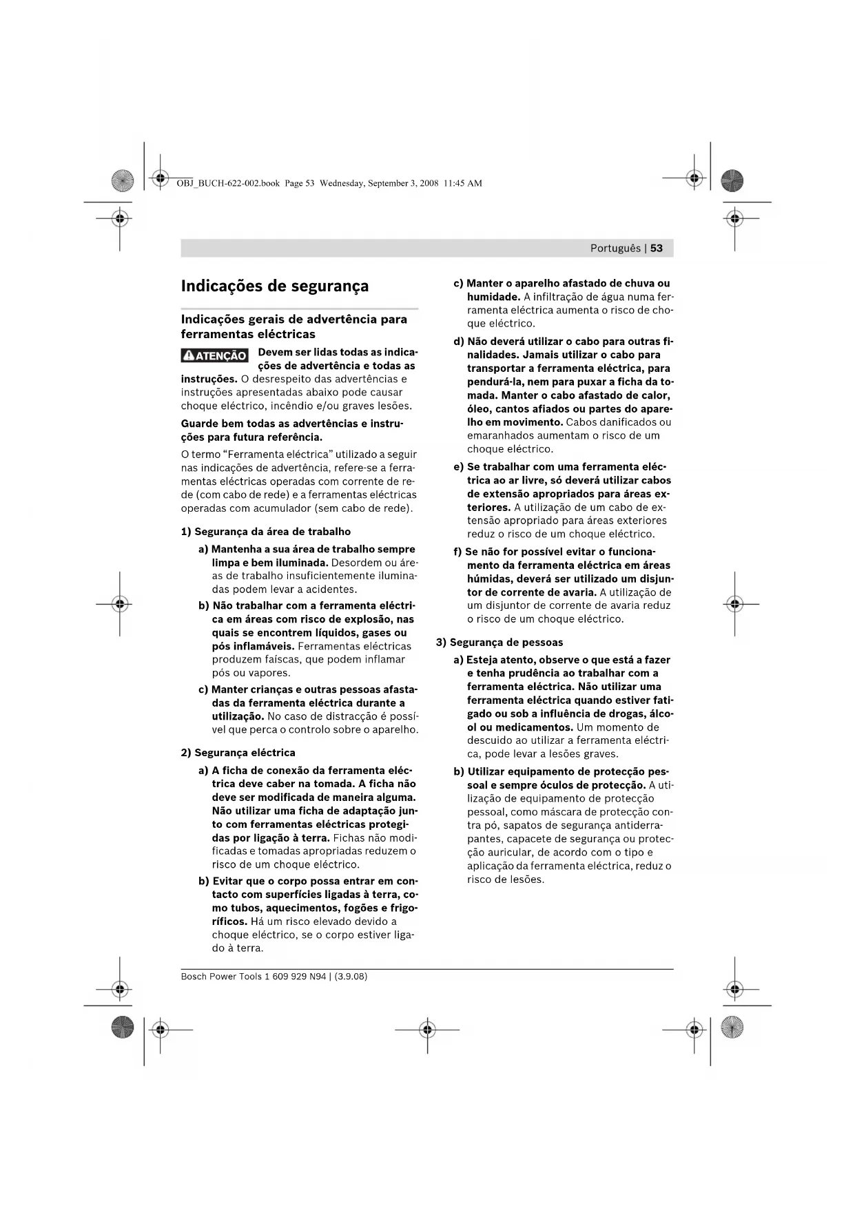 a) Esteja atento, observe o que está a fazer e tenha prudência ao trabalhar com a ferramenta eléctrica. Não utilizar uma ferramenta eléctrica quando estiver fati- gado ou sob a influência de drogas, álco- ol ou medicamentos. Um momento de descuido ao utilizar a ferramenta eléctri- ca, pode levar a lesões graves. b) Utilizar equipamento de protecção pes- soal e sempre óculos de protecção. A uti- lização de equipamento de protecção pessoal, como máscara de protecção con- tra pó, sapatos de segurança antiderra- pantes, capacete de segurança ou protec- ção auricular, de acordo com o tipo e aplicação da ferramenta eléctrica, reduz o risco de lesões. ATENÇÃO OBJ_BUCH-622-002.book Page 53 Wednesday, September 3, 2008 11:45 AM54 | Português 1 609 929 N94 | (3.9.08) Bosch Power Tools c) Evitar uma colocação em funcionamento involuntária. Assegure-se de que a ferra- menta eléctrica esteja desligada, antes de conectá-la à alimentação de rede e/ou ao acumulador, antes de levantá-la ou de transportá-la. Se tiver o dedo no interrup- tor ao transportar a ferramenta eléctrica ou se o aparelho for conectado à alimen- tação de rede enquanto estiver ligado, po- derão ocorrer acidentes. d) Remover ferramentas de ajuste ou cha- ves de boca antes de ligar a ferramenta eléctrica. Uma ferramenta ou chave que se encontre numa parte do aparelho em movimento pode levar a lesões. e) Evite uma posição anormal. Mantenha uma posição firme e mantenha sempre o equilíbrio. Desta forma é mais fácil con- trolar a ferramenta eléctrica em situações inesperadas. f) Usar roupa apropriada. Não usar roupa larga nem jóias. Mantenha os cabelos, roupas e luvas afastadas de partes em movimento. Roupas frouxas, cabelos lon- gos ou jóias podem ser agarrados por pe- ças em movimento. g) Se for possível montar dispositivos de aspiração ou de recolha, assegure-se de que estejam conectados e utilizados cor- rectamente. A utilização de uma aspira- ção de pó pode reduzir o perigo devido ao pó.