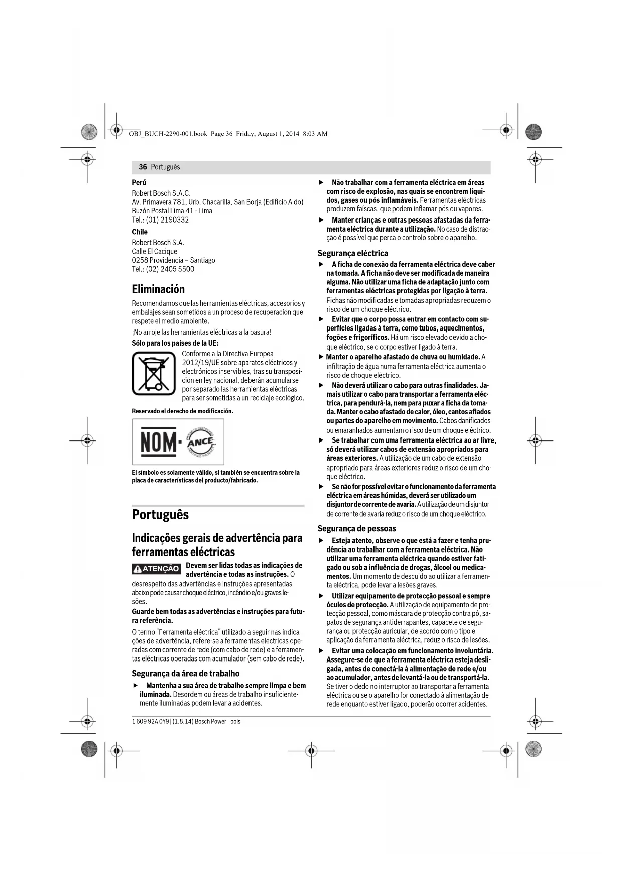 Ferramentas eléctricas, acessórios e embalagens devem ser