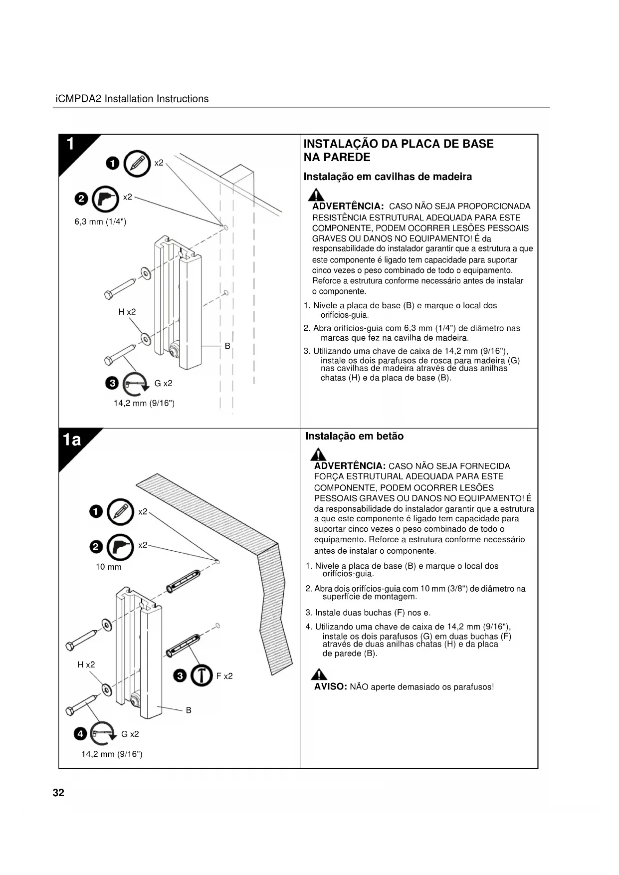 6,3 mm (1/4") Instalação em betão ADVERTÊNCIA: CASO NÃO SEJA FORNECIDA