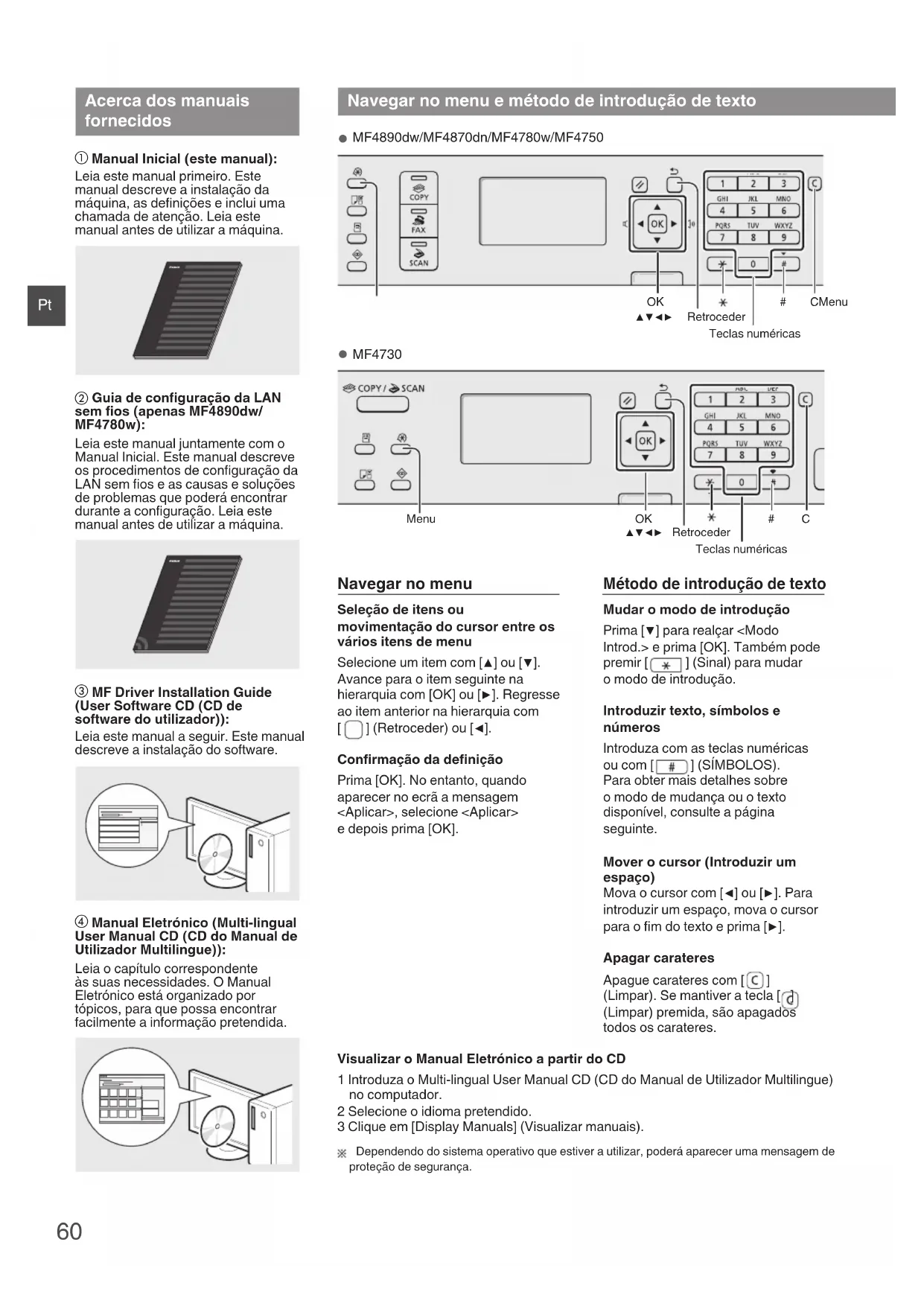 Navegar no menu e método de introdução de texto ● MF4890dw/MF4870dn/MF4780w/MF4750