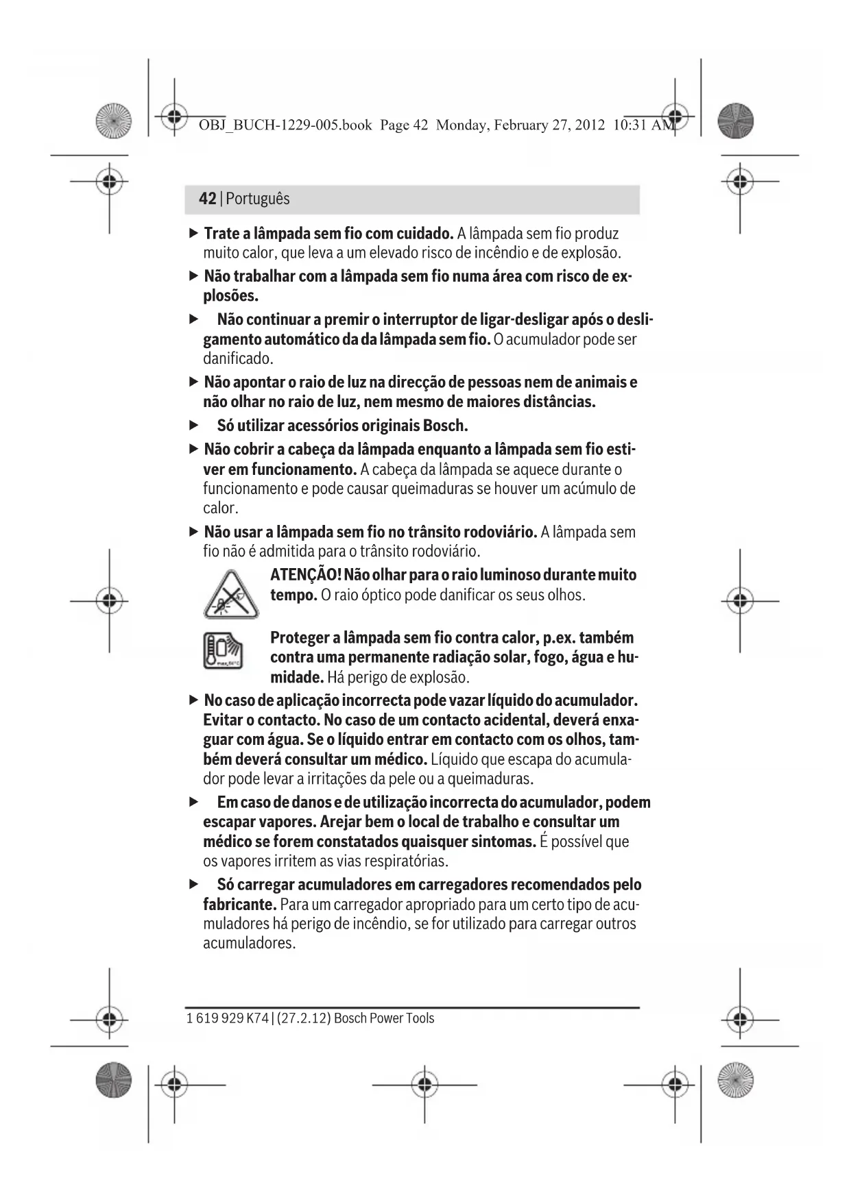 Peso conforme EPTA-Procedure 01/2003 g66 Classe de protecção /II OBJ_BUCH-1229-005.book Page 44 Monday, February 27, 2012 10:31 AMPortuguês | 45 Bosch Power Tools 1 619 929 K74 | (27.2.12) Montagem Carregar o acumulador (veja figura A) Nota: O acumulador é fornecido parcialmente carregado. Para assegurar a completa potência do acumulador, o acumulador deverá ser carregado completamente no carregador antes da primeira utilização. A lâmpada sem fio não pode ser utilizada durante o processo de carga; ela não está com defeito se não funcionar durante o processo de carga. O acumulador de iões de lítio pode ser carregado a qualquer altura, sem que a sua vida útil seja reduzida. Uma interrupção do processo de carga não danifica o acumulador. A “Electronic Cell Protection (ECP)” protege o acumulador de iões de lítio contra descarga total. A lâmpada sem fio é desligada através de um disjuntor de protecção, logo que o acumulador estiver descarregado. f Não continuar a premir o interruptor de ligar-desligar após o desli- gamento automático da da lâmpada sem fio. O acumulador pode ser danificado. Se a indicação do estado de carga 3 se iluminar em vermelho aquando a colocação em funcionamento, significa que o acumulador tem menos que 30 % de capacidade e deve ser carregado. Introduzir a ficha de carga 7 do carregador na tomada 4 no lado da lâmpa- da sem fio. f Observar a tensão de rede! A tensão da fonte de corrente deve coin- cidir com a chapa de identificação do carregador. Carregadores mar- cados para 230 V também podem ser operados com 220 V. O processo de carga começa com a lâmpada sem fio desligada, assim que a ficha de rede do carregador for introduzida na tomada. A indicação do estado de carga do acumulador 3 indica o progresso de carga. Durante o processo de carga a indicação pisca verde. Se a indica- ção do estado de carga do acumulador 3 estiver permanentemente liga- da, significa que o acumulador está completamente carregado. Se o carregador não for utilizado, separe-o da rede de corrente elétrica, para poupar energia. Observar a indicação sobre a eliminação de forma ecológica. OBJ_BUCH-1229-005.book Page 45 Monday, February 27, 2012 10:31 AM1 619 929 K74 | (27.2.12) Bosch Power Tools 46 | Português Funcionamento Colocação em funcionamento Ligar e desligar Para ligar a lâmpada sem fio, deverá empurrar o interruptor de ligar-des- ligar 2, sem pressão, para cima. Para desligar a lâmpada sem fio, deverá empurrar o interruptor de ligar- desligar 2, sem pressão, para baixo. Se a lâmpada sem fio não for utilizada, desligue-a para poupar energia. Indicações de trabalho Possibilidades de aplicação (veja figura B) Com o arco multifuncional 6, que pode ser basculado, a lâmpada sem fio pode ser aplicada de diversos modos. – Prender com o prego pelo entalhe no arco multifuncional. – Pendurar com a fixação especial no canto superior de uma porta. – Apropriado para qualquer local de instalação devido ao arco multifun- cional basculante. Girar a cabeça da lâmpada Dependendo da aplicação, a cabeça da lâmpada 1 pode ser deslocada até 200°. – Com candeeiro de pé com cabeça direccionada para cima. – Ilumina o recinto deslocada por 90°. – Com cabeça de iluminação inclinada aprox. 45°, ilumina o local de tra- balho, por ex. uma secretária, sem ofuscar. Manutenção e serviço Manutenção e limpeza O acumulador não funciona mais; dirija-se a um serviço pós-venda autori- zado para ferramentas eléctricas Bosch. A lâmpada sem fio não requer manutenção e nenhuma das suas peças ne- cessita de manutenção ou precisa ser substituída. Para evitar danos, o vidro de plástico da lâmpada sem fio só deve ser lim- po com um pano macio e seco. Não utilizar detergentes nem solventes. OBJ_BUCH-1229-005.book Page 46 Monday, February 27, 2012 10:31 AMPortuguês | 47 Bosch Power Tools 1 619 929 K74 | (27.2.12) Se a lâmpada sem fio ou o carregador falharem apesar de cuidadosos pro- cessos de fabricação e de teste, a reparação deverá ser executada por uma oficina de serviço pós-venda autorizada para ferramentas eléctricas Bosch. Para todas as questões e encomendas de peças sobressalentas é impres- cindível indicar o número de produto de 10 dígitos como consta na placa de características da lâmpada sem fio e no carregador. Serviço pós-venda e assistência ao cliente O serviço pós-venda responde às suas perguntas a respeito de serviços de reparação e de manutenção do seu produto, assim como das peças so- bressalentes. Desenhos explodidos e informações sobre peças sobressa- lentes encontram-se em: www.bosch-pt.com A nossa equipa de consultores Bosch esclarece com prazer todas as suas dúvidas a respeito da compra, aplicação e ajuste dos produtos e acessó- rios. Portugal Robert Bosch LDA Avenida Infante D. Henrique Lotes 2E – 3E 1800 Lisboa Tel.: +351 (021) 8 50 00 00 Fax: +351 (021) 8 51 10 96 Brasil Robert Bosch Ltda. Caixa postal 1195 13065-900 Campinas Tel.: +55 (0800) 70 45446 www.bosch.com.br/contacto Transporte Os acumuladores de iões de lítio, contidos, estão sujeitos ao direito de materiais perigosos. Os acumuladores podem ser transportados na rua pelo utilizador, sem mais obrigações. Na expedição por terceiros (por ex: transporte aéreo ou expedição), de- vem ser observadas as especiais exigências quanto à embalagem e à de- signação. Neste caso é necessário consultar um especialista de materiais perigosos ao preparar a peça a ser trabalhada. OBJ_BUCH-1229-005.book Page 47 Monday, February 27, 2012 10:31 AM1 619 929 K74 | (27.2.12) Bosch Power Tools 48 | Italiano Eliminação A lâmpada sem fio, o acumulador, o carregador, os acessórios e as embalagens devem ser enviados a uma reciclagem ecológica de matérias primas. Não deitar a lâmpada sem fio, os carregadores/as pilhas e o carregador no lixo doméstico! Apenas países da União Europeia: Conform