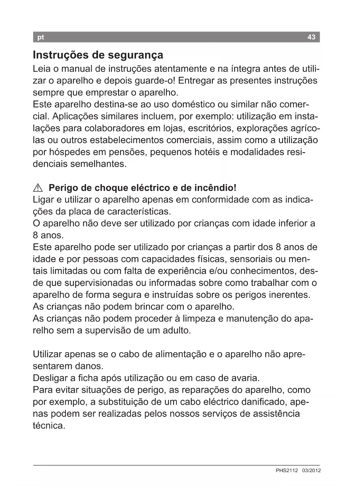 Perigo de choque eléctrico! Antes de limpar o aparelho, desligar a cha da tomada. Não colocar o aparelho em contacto com água. Não utilizar aparelho de limpeza a vapor. ● Limpar o aparelho apenas por fora com um pano húmido e, em seguida, secá-lo com um pano. Não utilizar detergentes agressivos ou abrasivos. Dados técnicos Ligação eléctrica (tensão / frequência) 220-240 V / 50 Hz Potência 31 W Eliminação do aparelho Eliminar a embalagem de forma ecológica. Esta máquina cumpre a Directiva Europeia 2002/96/CE relativa aos resíduos de equi- pamentos eléctricos e electrónicos (REEE). A directiva dene as regras para a retoma e reciclagem de aparelhos usados em todo o espaço da UE. Contactar o revendedor especializado para mais informações. Garantia Para este aparelho vigoram as condições de garantia publicadas pelo nosso repre- sen tante no país em que o mesmo for ad- quirido. O representante onde comprou o aparelho poderá dar-lhe mais pormenores sobre este assunto. Para a prestação de qualquer serviço dentro da garantia é, no entanto, necessária a apresentação do do- cumento de compra do aparelho. Salvo alterações técnicas. A47 PHS2112 03/2012 47el Υποδείξεις ασφαλείας Διαβάστε παρακαλώ προσεκτικά τις οδηγίες χρήσης, ενεργήστε σύμφωνα με αυτές και φυλάξτε τις! Η συσκευή θα πρέπει να συ- νοδεύεται από τις παρούσες οδηγίες όταν παραδίδεται σε έναν άλλο