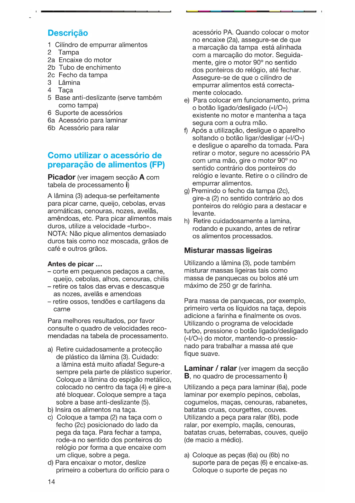 Retire cuidadosamente a protecção de plástico da lâmina (3). Cuidado: a lâmina está muito afiada! Segure-a sempre pela parte de plástico superior. Coloque a lâmina do espigão metálico, colocado no centro da taça (4) e gire-a até bloquear. Coloque sempre a taça sobre a base anti-deslizante (5). b) Insira os alimentos na taça. c) Coloque a tampa (2) na taça com o fecho (2c) posicionado do lado da pega da taça. Para fechar a tampa, rode-a no sentido dos ponteiros do relógio por forma a que encaixe com um clique, sobre a pega. d) Para encaixar o motor, deslize primeiro a cobertura do orifício para o acessório PA. Quando colocar o motor no encaixe (2a), assegure-se de que a marcação da tampa está alinhada com a marcação do motor. Seguida- mente, gire o motor 90º no sentido dos ponteiros do relógio, até fechar. Assegure-se de que o cilíndro de empurrar alimentos está correcta- mente colocado. e) Para colocar em funcionamento, prima o botão ligado/desligado («I/O») existente no motor e mantenha a taça segura com a outra mão. f) Após a utilização, desligue o aparelho soltando o botão ligar/desligar («I/O») e desligue o aparelho da tomada. Para retirar o motor, segure no acessório PA com uma mão, gire o motor 90º no sentido contrário dos ponteiros do relógio e levante. Retire o o cilíndro de empurrar alimentos. g) Premindo o fecho da tampa (2c), gire-a (2) no sentido contrário ao dos ponteiros do relógio para a destacar e levante. h) Retire cuidadosamente a lamina, rodando e puxando, antes de retirar os alimentos processados. Misturar massas ligeiras Utilizando a lâmina (3), pode também misturar massas ligeiras tais como massa de panquecas ou bolos até um máximo de 250 gr de farinha. Para massa de panquecas, por exemplo, primeiro verta os líquidos na taça, depois adicione a farinha e finalmente os ovos. Utilizando o programa de velocidade turbo, pressione o botão ligado/desligado