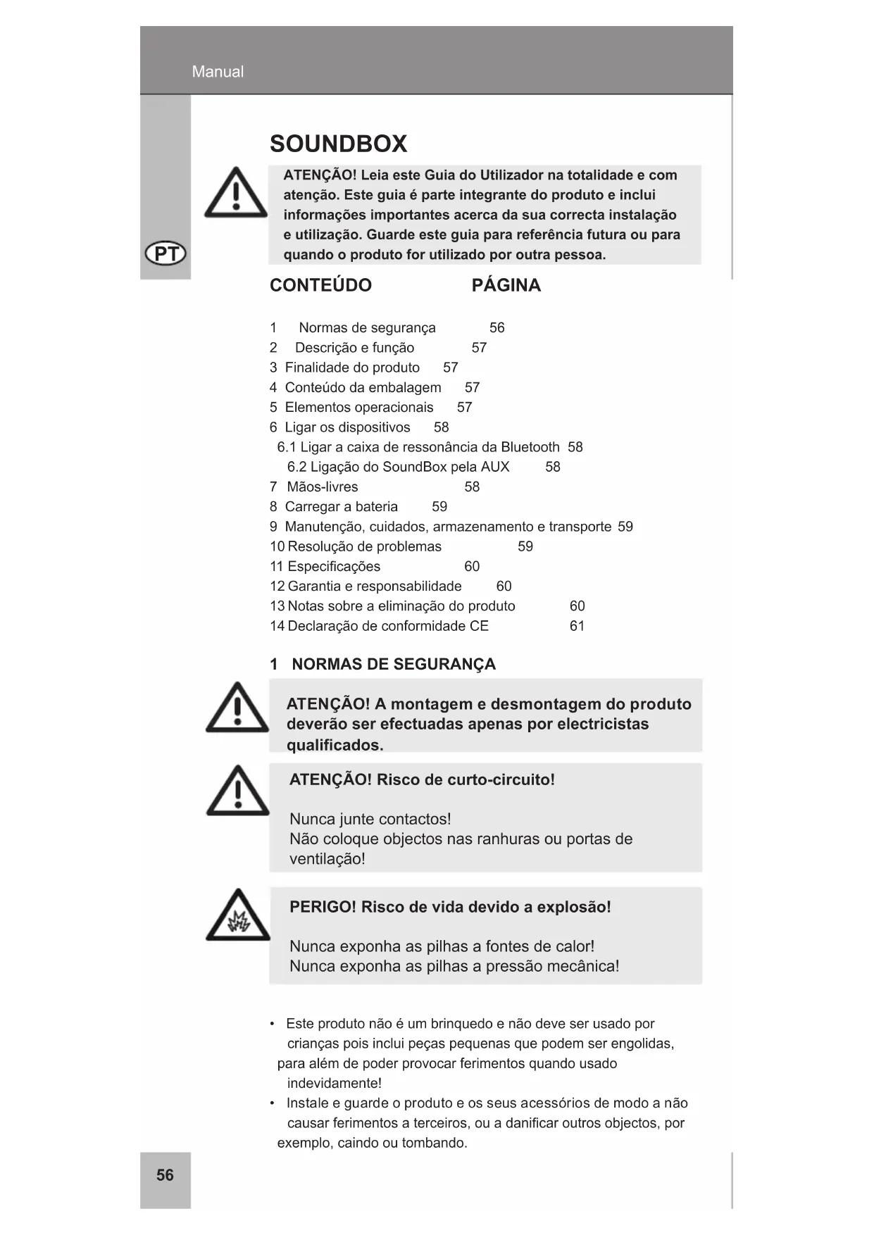6.2LigaçãodoSoundBoxpelaAUX 58 7 Mãos-livres 58 8 Carregar a bateria 59 9Manutenção,cuidados,armazenamentoetransporte 59 10Resoluçãodeproblemas 59 11Especicações 60 12 Garantia e responsabilidade 60 13Notassobreaeliminaçãodoproduto 60 14DeclaraçãodeconformidadeCE 61