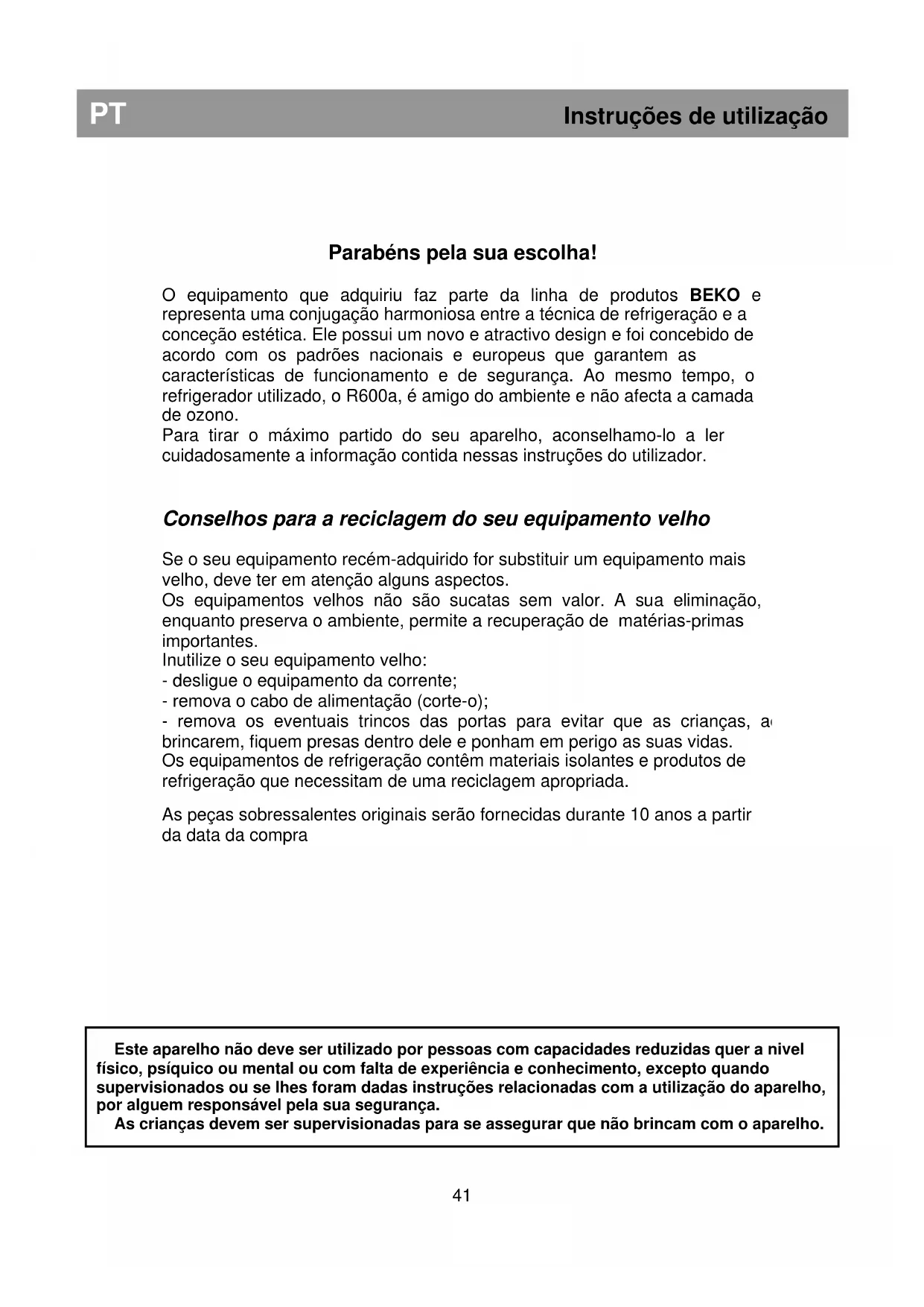 Este aparelho não deve ser utilizado por pessoas com capacidades reduzidas quer a nivel