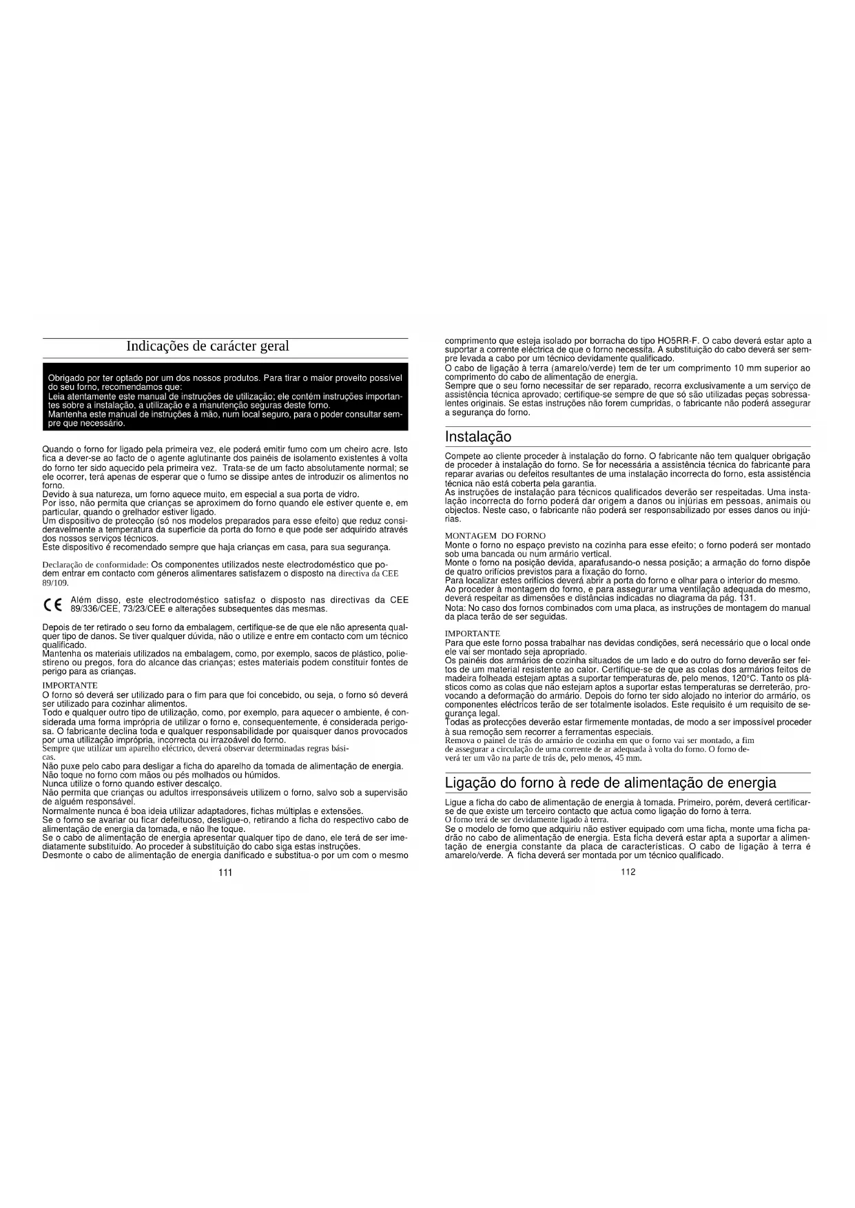 111Se a ficha do cabo e a tomada forem incompatíveis, deverá mandar proceder à substituiçãoda tomada por um técnico devidamente qualificado. Além disso, um técnico devidamente qua-lificado deverá certificar-se também de que os cabos de energia estão aptos a suportar a cor-rente de que o forno necessita para poder trabalhar.Se assim o quiser, poderá igualmente instalar um interruptor de ligar/desligar, com uma di-stância mínima entre contactos de 3 mm, à alimentação de energia. As ligações terão de terem consideração a corrente alimentada e deverão satisfazer os requisitos legais em vigor. Ocabo de ligação à terra, amarelo/verde, não deverá ser ligado/desligado pelo interruptor de li-gar/desligar acima referido. Quer a tomada, quer o interruptor de ligar/desligar utilizados paraa ligação à rede de energia deverão estar colocados de forma a poderem ser acedidos comfacilidade depois do forno ter sido instalado. Importante: Durante a instalação do forno, coloque o cabo de alimentação de energia de mo- do a que não fique submetido a temperaturas superiores a 50ºC em nenhum ponto da sua ex-tensão.O forno satisfaz as normas e requisitos de segurança das entidades reguladoras competen-tes. O forno só poderá ser utilizado com segurança se tiver sido ligado à terra conforme esti-pulado nos requisitos legais em vigor relativos à segurança das instalações eléctricas.Certifique-se sempre de que o forno foi devidamente ligado à terra.Todos os cabos e fios utilizados deverão estar aptos a suportarem a corrente eléctrica máximade que o forno necessita. Esta corrente está indicada na placa de características. Se tiver qualquer dúvida, seja ela qual for, recorra aos serviços de um técnico devidamentequalificado.O fabricante não poderá ser responsabilizado por qualquer tipo de danos ou injúriasprovocados em pessoas, animais ou objectos resultantes de uma má ligação do forno àterra, ou mesmo da sua falta de ligação à terra. AVISO: