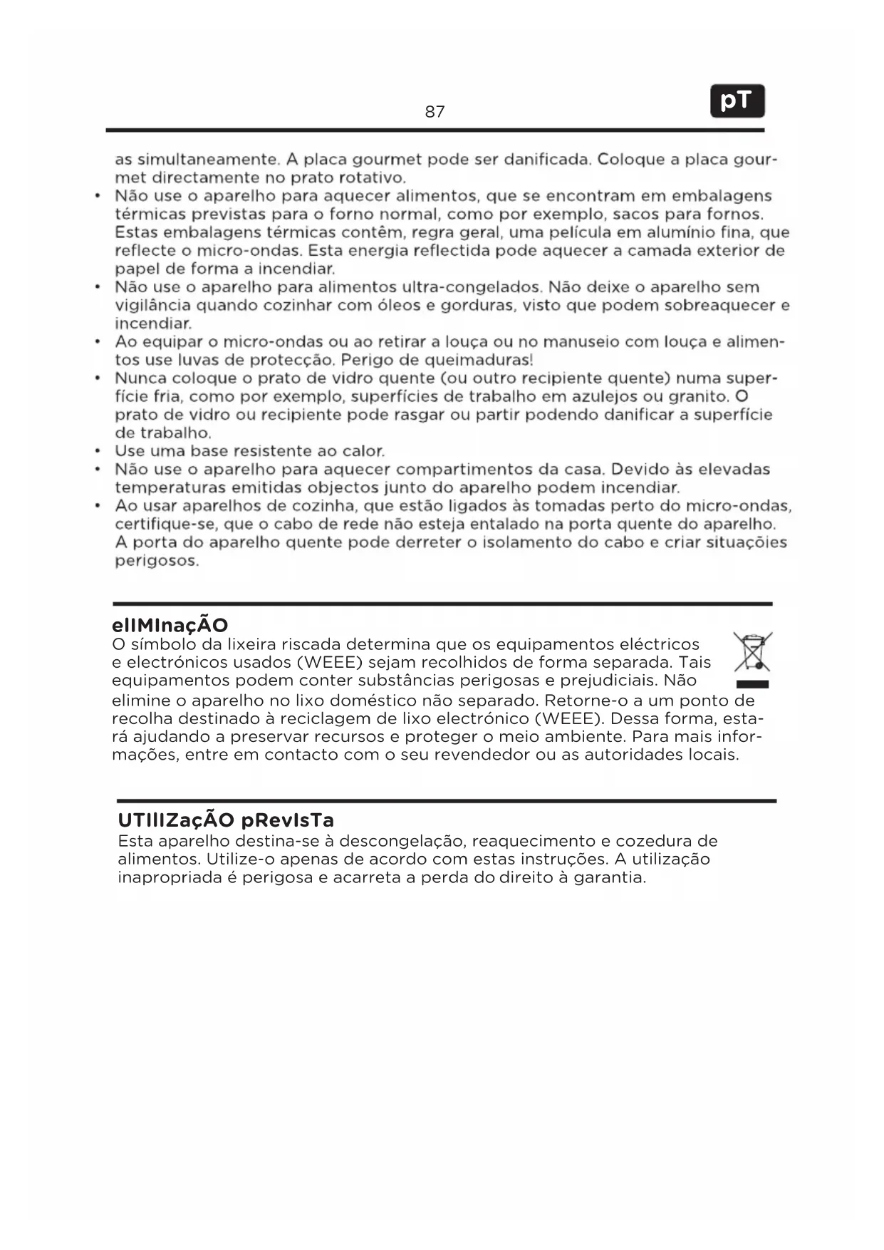 O símbolo da lixeira riscada determina que os equipamentos eléctricos e electrónicos usados (WEEE) sejam recolhidos de forma separada. Tais equipamentos podem conter substâncias perigosas e prejudiciais. Não elimine o aparelho no lixo doméstico não separado. Retorne-o a um ponto de recolha destinado à reciclagem de lixo electrónico (WEEE). Dessa forma, esta- rá ajudando a preservar recursos e proteger o meio ambiente. Para mais infor- mações, entre em contacto com o seu revendedor ou as autoridades locais. elIMInaçãO Esta aparelho destina-se à descongelação, reaquecimento e cozedura de alimentos. Utilize-o apenas de acordo com estas instruções. A utilização inapropriada é perigosa e acarreta a perda do direito à garantia. UTIlIZaçãO pRevIsTa88