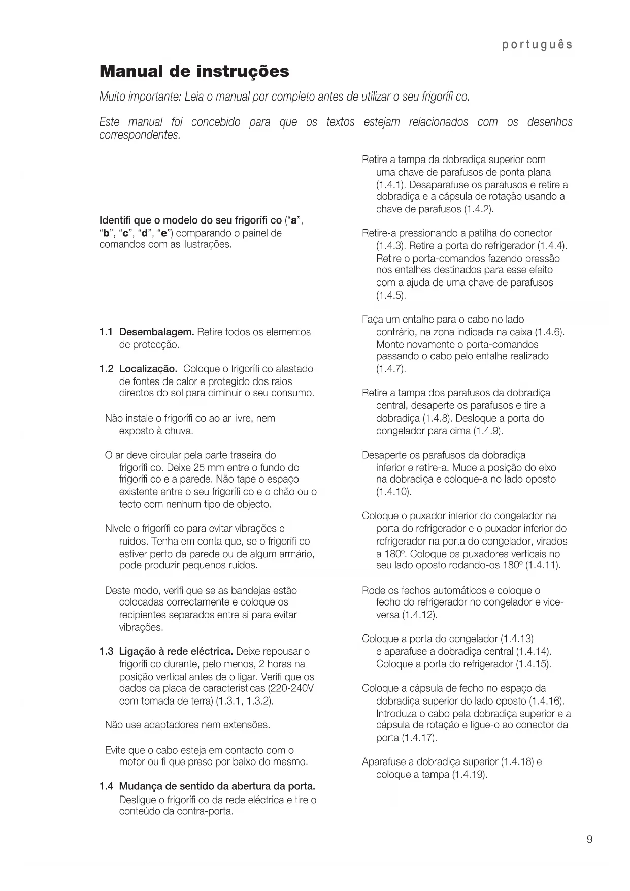 Identifi cação Retire a tampa da dobradiça superior com uma chave de parafusos de ponta plana (1.4.1). Desaparafuse os parafusos e retire a dobradiça e a cápsula de rotação usando a chave de parafusos (1.4.2). Retire-a pressionando a patilha do conector (1.4.3). Retire a porta do refrigerador (1.4.4). Retire o porta-comandos fazendo pressão nos entalhes destinados para esse efeito com a ajuda de uma chave de parafusos (1.4.5). Faça um entalhe para o cabo no lado contrário, na zona indicada na caixa (1.4.6). Monte novamente o porta-comandos passando o cabo pelo entalhe realizado (1.4.7). Retire a tampa dos parafusos da dobradiça central, desaperte os parafusos e tire a dobradiça (1.4.8). Desloque a porta do congelador para cima (1.4.9). Desaperte os parafusos da dobradiça inferior e retire-a. Mude a posição do eixo na dobradiça e coloque-a no lado oposto (1.4.10). Coloque o puxador inferior do congelador na porta do refrigerador e o puxador inferior do refrigerador na porta do congelador, virados a 180º. Coloque os puxadores verticais no seu lado oposto rodando-os 180º (1.4.11). Rode os fechos automáticos e coloque o fecho do refrigerador no congelador e vice- versa (1.4.12). Coloque a porta do congelador (1.4.13) e aparafuse a dobradiça central (1.4.14). Coloque a porta do refrigerador (1.4.15). Coloque a cápsula de fecho no espaço da dobradiça superior do lado oposto (1.4.16). Introduza o cabo pela dobradiça superior e a cápsula de rotação e ligue-o ao conector da porta (1.4.17). Aparafuse a dobradiça superior (1.4.18) e coloque a tampa (1.4.19).português