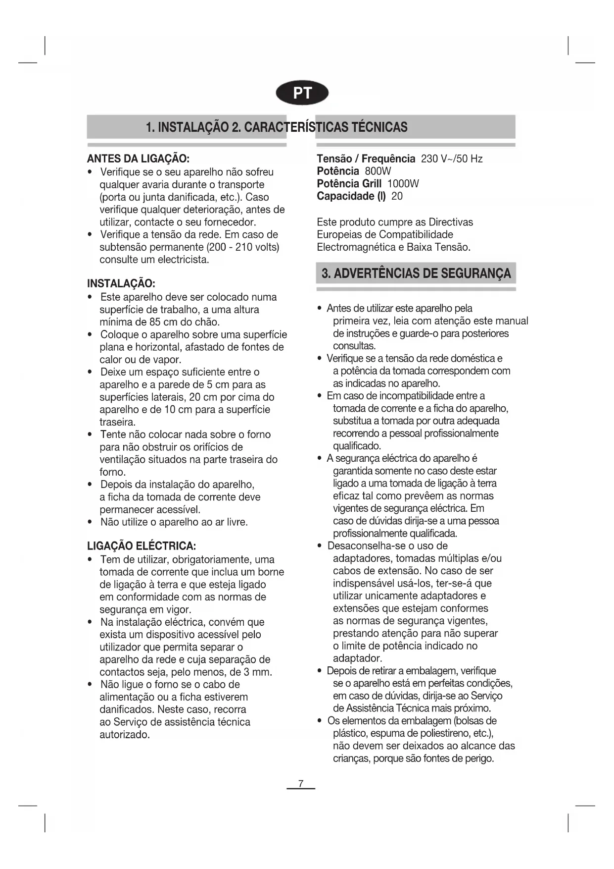 1. INSTALAÇÃO 2. CARACTERÍSTICAS TÉCNICAS Tensão / Frequência 230 V~/50 Hz