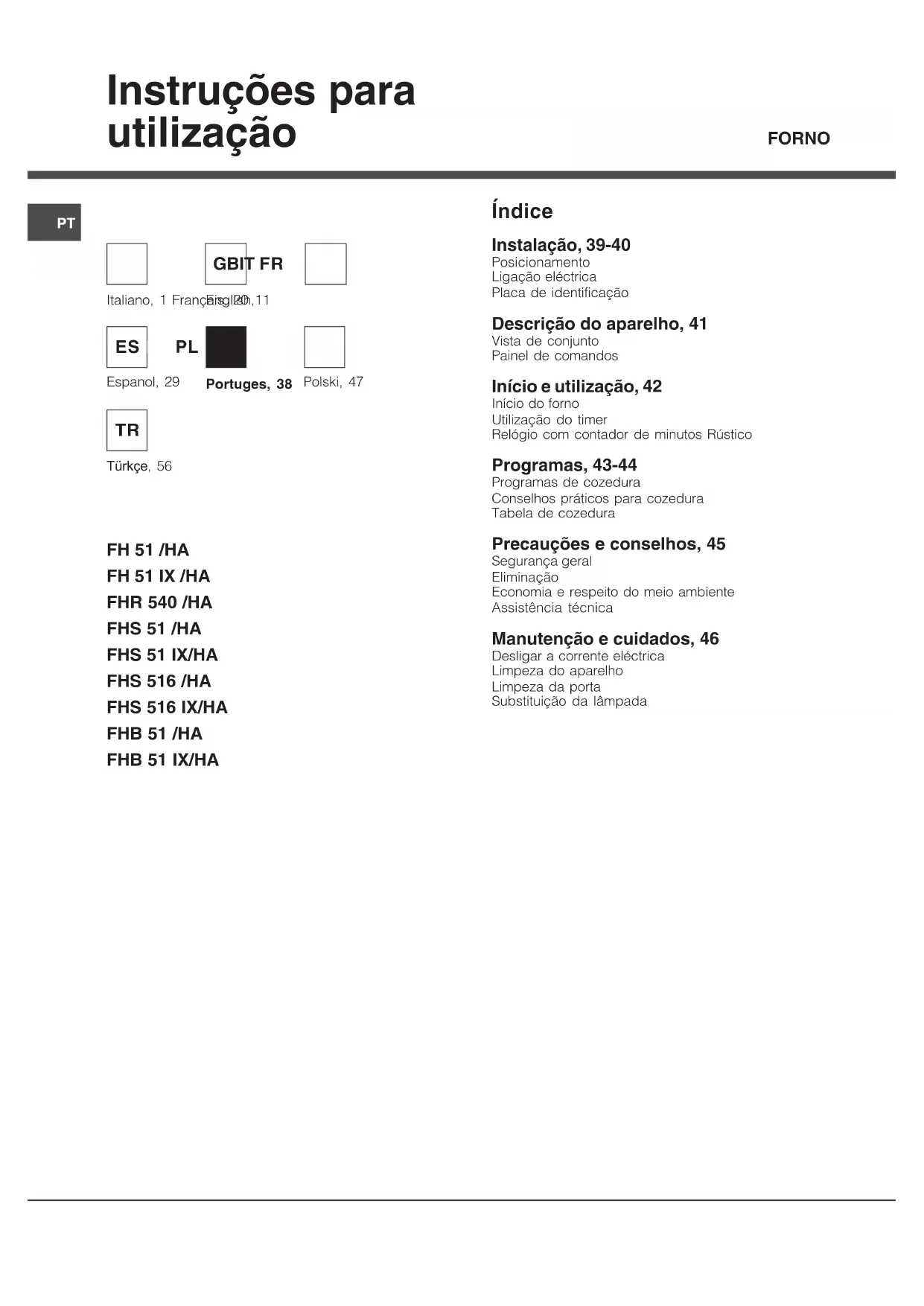 Encontre gratuitamente o manual do aparelho FH 51 IXHA HOTPOINT-ARISTON em formato PDF.