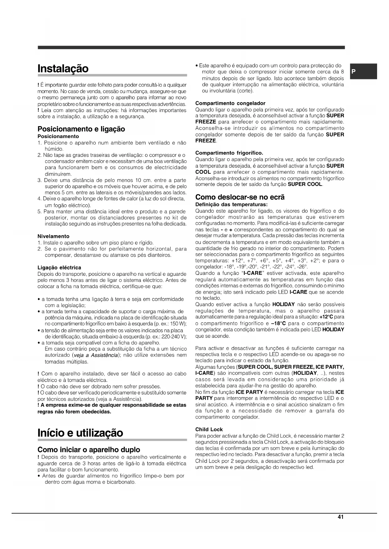 Como iniciar o aparelho duplo ! Depois do transporte, posicione o aparelho verticalmente eaguarde cerca de 3 horas antes de ligá-lo à tomada eléctricapara facilitar o bom funcionamento.• Antes de guardar alimentos no frigorífico limpe-o bem pordentro com água morna e bicarbonato.• Este aparelho é equipado com um controlo para protecção domotor que deixa o compressor iniciar somente cerca da 8minutos depois de ser ligado. Isto acontece também depoisde qualquer interrupção na alimentação eléctrica, voluntáriaou involuntária (corte).Compartimento congeladorQuando ligar o aparelho pela primeira vez, após ter configuradoa temperatura desejada, é aconselhável activar a função SUPERFREEZE para arrefecer o compartimento mais rapidamente.Aconselha-se introduzir os alimentos no compartimentocongelador somente depois de ter saído da função SUPERFREEZE.Compartimento frigorífico.Quando ligar o aparelho pela primeira vez, após ter configuradoa temperatura desejada, é aconselhável activar a função SUPERCOOL para arrefecer o compartimento mais rapidamente.Aconselha-se introduzir os alimentos no compartimento frigoríficosomente depois de ter saído da função SUPER COOL. Como deslocar-se no ecrã Definição das temperaturas:Quando este aparelho for ligado, os visores do frigorífico e docongelador mostrarão as temperaturas que estiveremconfiguradas no momento. Para modificá-las é suficiente carregar nas teclas - e + correspondentes ao compartimento do qual se desejar mudar a temperatura. Cada pressão das teclas incrementaou decrementa a temperatura e em modo equivalente também aquantidade de frio gerado no interior do compartimento. Podemser seleccionadas para o compartimento frigorífico as seguintestemperaturas: +12°, +7°, +6°, +5°, +4°, +3°, +2°; e para ocongelador: -18°, -19°,-20°, -21°, -22°, -24°, -26°.Quando a função “I-CARE” estiver activada, este aparelhoregulará automaticamente as temperaturas em função dascondições internas e externas do frigorífico, consumindo o mínimode energia; isto será indicado pelo LED I-CARE que se acendeno teclado.Quando estiver activa a função HOLIDAY não serão possíveisregulações de temperatura, mas o aparelho passará automaticamente para a regulação ideal para a situação: +12°C para o compartimento frigorífico e –18°C para o compartimentocongelador, esta condição também é indicada pelo LED HOLIDAYque se acende.Para activar e desactivar as funções é suficiente carregar narespectiva tecla e o respectivo LED acende-se ou apaga-se noteclado para indicar o estado da função.Algumas funções (SUPER COOL, SUPER FREEZE, ICE PARTY, I-CARE) são incompatíveis com outras (HOLIDAY, ..), nestes casos será levada em consideração uma prioridade jáestabelecida para ajudar-lhe na gestão do aparelho. No fim da função ICE PARTY é necessário carregar na tecla ICE PARTY para interromper a intermitência do respectivo LED e osinal acústico. A intermitência e o sinal acústico sinalizam o fimda função e a necessidade de remover a garrafa docompartimento congelador.Child LockPara poder activar a função de Child Lock, é necessário manter 2segundos pressionada a tecla Child Lock, a activação do bloqueiodas teclas é confirmada por um som breve e pela iluminação dorespectivo led no teclado. Para desactivar a função, premir a teclaChild Lock por 2 segundos, a desactivação será confirmada porum som breve e pela desligação do respectivo led.42