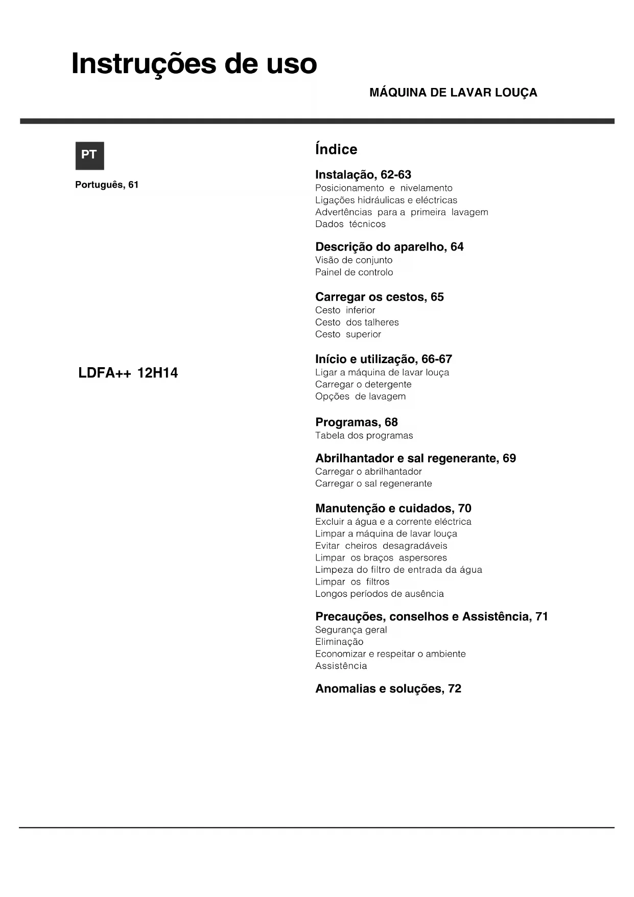 - Apague la máquina presionando el botón ENCENDIDO/APAGADO (ON/OFF). Cierre el grifo de agua para evitar inundaciones y desenchufe el aparato. Controle que el filtro de entrada de agua no esté obstruido con impurezas. (ver el capítulo “Mantenimiento y Cuidados”)Instruções de uso Índice Instalação, 62-63 Posicionamento e nivelamento Ligações hidráulicas e eléctricas Advertências para a primeira lavagem Dados técnicos Descrição do aparelho, 64 Visão de conjunto Painel de controlo Carregar os cestos, 65 Cesto inferior Cesto dos talheres Cesto superior Início e utilização, 66-67 Ligar a máquina de lavar louça Carregar o detergente Opções de lavagem Programas, 68 Tabela dos programas Abrilhantador e sal regenerante, 69 Carregar o abrilhantador Carregar o sal regenerante Manutenção e cuidados, 70 Excluir a água e a corrente eléctrica Limpar a máquina de lavar louça Evitar cheiros desagradáveis Limpar os braços aspersores Limpeza do filtro de entrada da água Limpar os filtros Longos períodos de ausência Precauções, conselhos e Assistência, 71 Segurança geral Eliminação Economizar e respeitar o ambiente Assistência Anomalias e soluções, 72 Português, 61