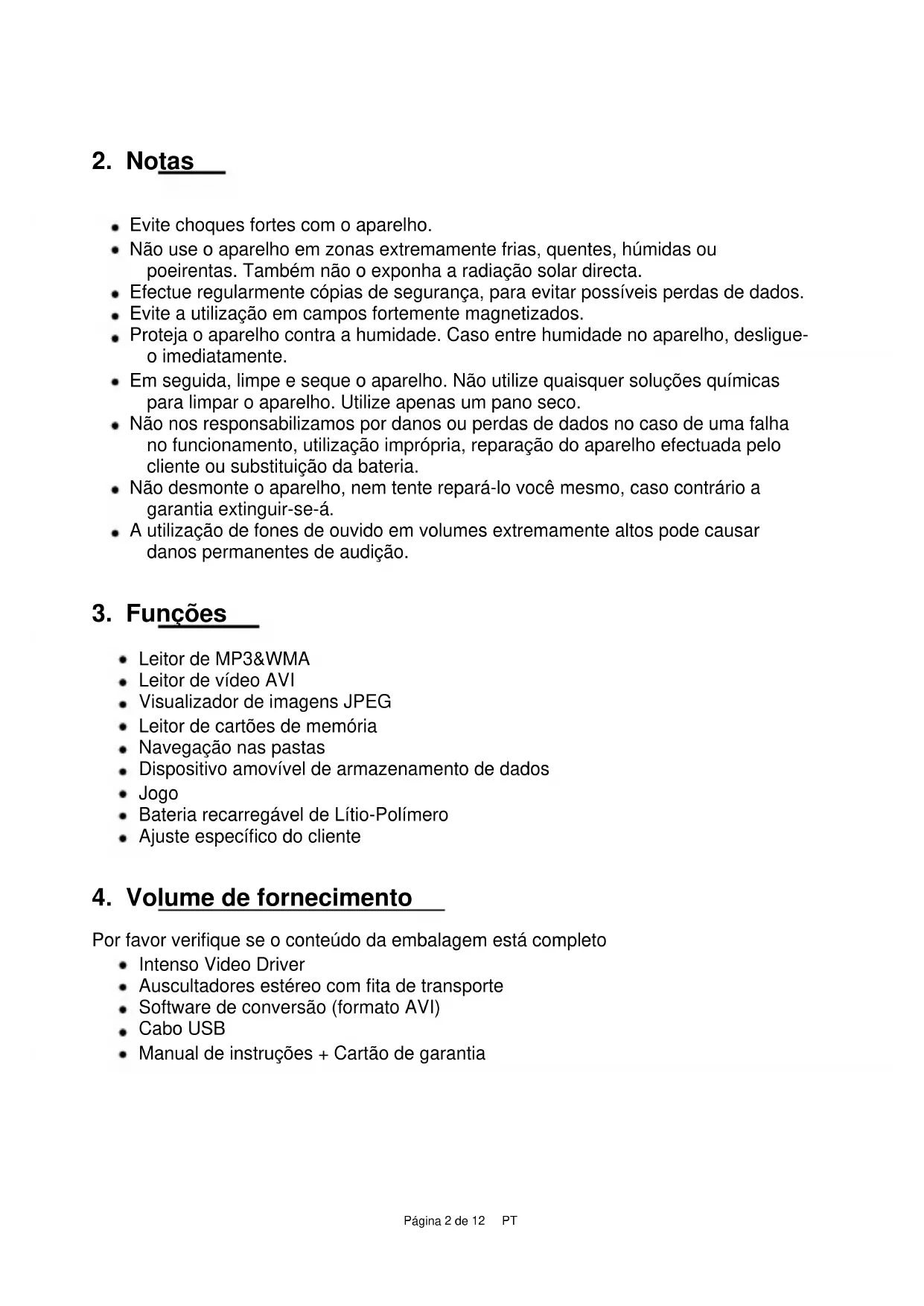 Por favor verifique se o conteúdo da embalagem está completo Intenso Video Driver Auscultadores estéreo com fita de transporte Software de conversão (formato AVI) Cabo USB Manual de instruções + Cartão de garantiaPágina 3 de 12 PT