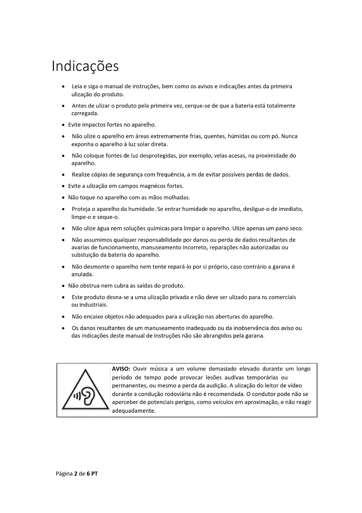 AVISO: Ouvir música a um volume demasiado elevado durante um longo período de tempo pode provocar lesões auditivas temporárias ou permanentes, ou mesmo a perda da audição. A utilização do leitor de vídeo durante a condução rodoviária não é recomendada. O condutor pode não se aperceber de potenciais perigos, como veículos em aproximação, e não reagir adequadamente.Página 3 de 6 PT