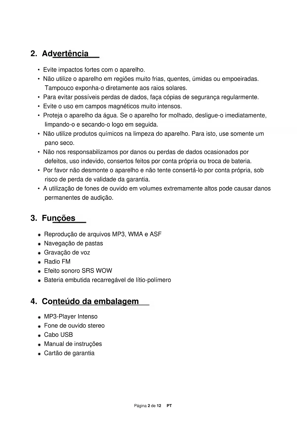 MP3-Player Intenso Fone de ouvido stereo Cabo USB Manual de instruções Cartão de garantiaPágina 3 de 12 PT