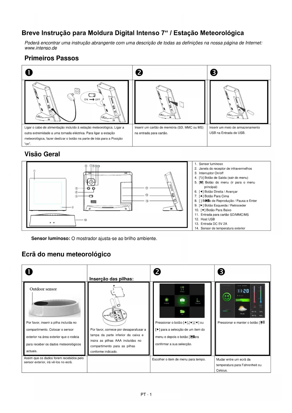 Cuidados Para evitar perigos derivados da corrente eléctrica não remover os parafusos nem a tampa da estação meteorológica. Não operar este dispositivo perto da água. Não expor o dispositivo à chuva e à humidade. Não colocar objectos que contenham água ou outros fluidos perto do dispositivo. Não instalar a fotografia perto de aquecedores, fornos ou outros dispositivos que emitam calor. Não abrir a caixa. Não tentar reparar o dispositivo sozinho, leve-o antes a reparar por pessoal qualificado apenas. Evitar usar o dispositivo em zonas com areia. Inserir totalmente a tomada de alimentação de energia na abertura da estação meteorológica Intenso. Isto irá evitar carga electrostática. Ligar correctamente e em segurança todas as portas. Não empurrar o ecrã. Proteger o ecrã da luz solar directa. A moldura de fotografias só apresenta formatos de dados compatíveis. As imagens podem estar protegidas pelos direitos de terceiros. A reprodução sem licença poderá infringir direitos de autor. Durante a operação, não tocar na estação meteorológica Intenso com objectos de metal. Evitar operar o dispositivo em almofadas, sofás ou outros objectos que suportem o desenvolvimento de calor poi s existe o perigo de sobreaquecimento do dispositivo. Não remover cartões de memória durante a operação de leitura. Isto poderá fazer com que o sistema falhe ou se percam dados. Não desligar o dispositivo durante uma apresentação de diapositivos em execução. Não embrulhar o dispositivo directamente após um uso prolongado. Garantir um arrefecimento suficiente. Caso contrário, existe o perigo de sobreaquecimento. Para garantir um melhor serviço, poderá ser necessário fazer-se mudanças nas instruções. Manutenção do dispositivo O dispositivo deverá ser desligado. Nunca pulverizar ou aplicar um fluido directamente para o ecrã ou para a caixa. Limpar os ecrãs / caixa / moldura Limpar cuidadosamente a caixa, moldura e ecrã LCD com um pano macio sem fiapos e quími cos. Usar apenas agentes de limpeza que foram especificamente concebidos para ecrãs LCD. Eliminação de resíduos eléctricos Os dispositivos com este símbolo estão sujeitos à Directiva EG 2002/96/EG. Todos os equipamentos eléctricos e equipamentos antigos deverão ser eliminados separadamente do lixo doméstico e deverão ser devolvidos às autoridades estatais concebidas para esse fim. A eliminação correcta de equipamentos eléctricos poderá evitar danos ambientais.PL - 1 Skrócona instrukcja obsługi 7“ cyfrowa ramka fotograficzna Intenso / stacja pogodowa Dokładną instrukcję obsługi wraz z opisem wszystkich możliwości ustawiania znajdą Państwo na naszej stronie internetowej: www.intenso.de Pierwsze kroki