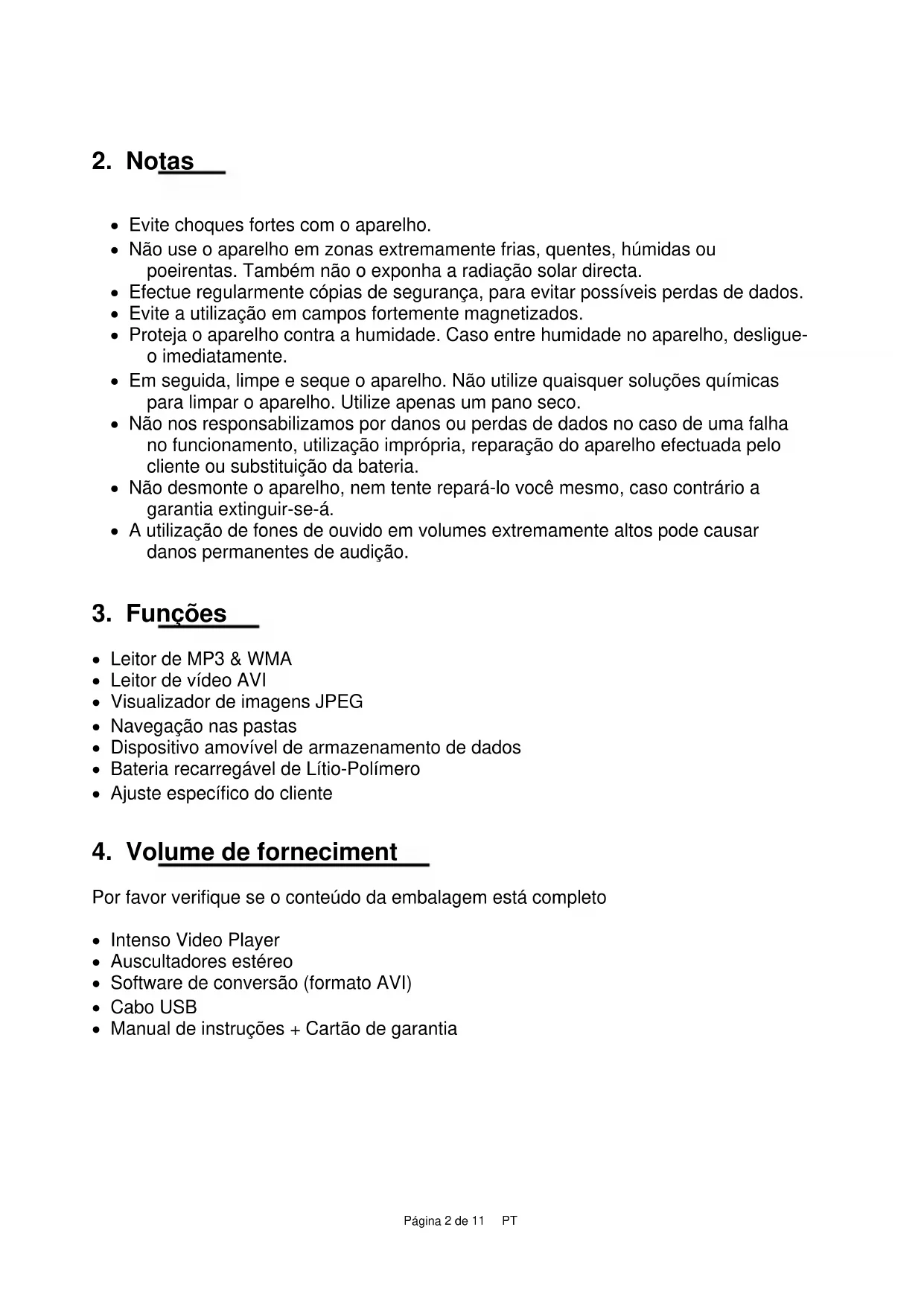 Por favor verifique se o conteúdo da embalagem está completo Intenso Video Player Auscultadores estéreo Software de conversão (formato AVI) Cabo USB Manual de instruções + Cartão de garantiaPágina 3 de 11 PT