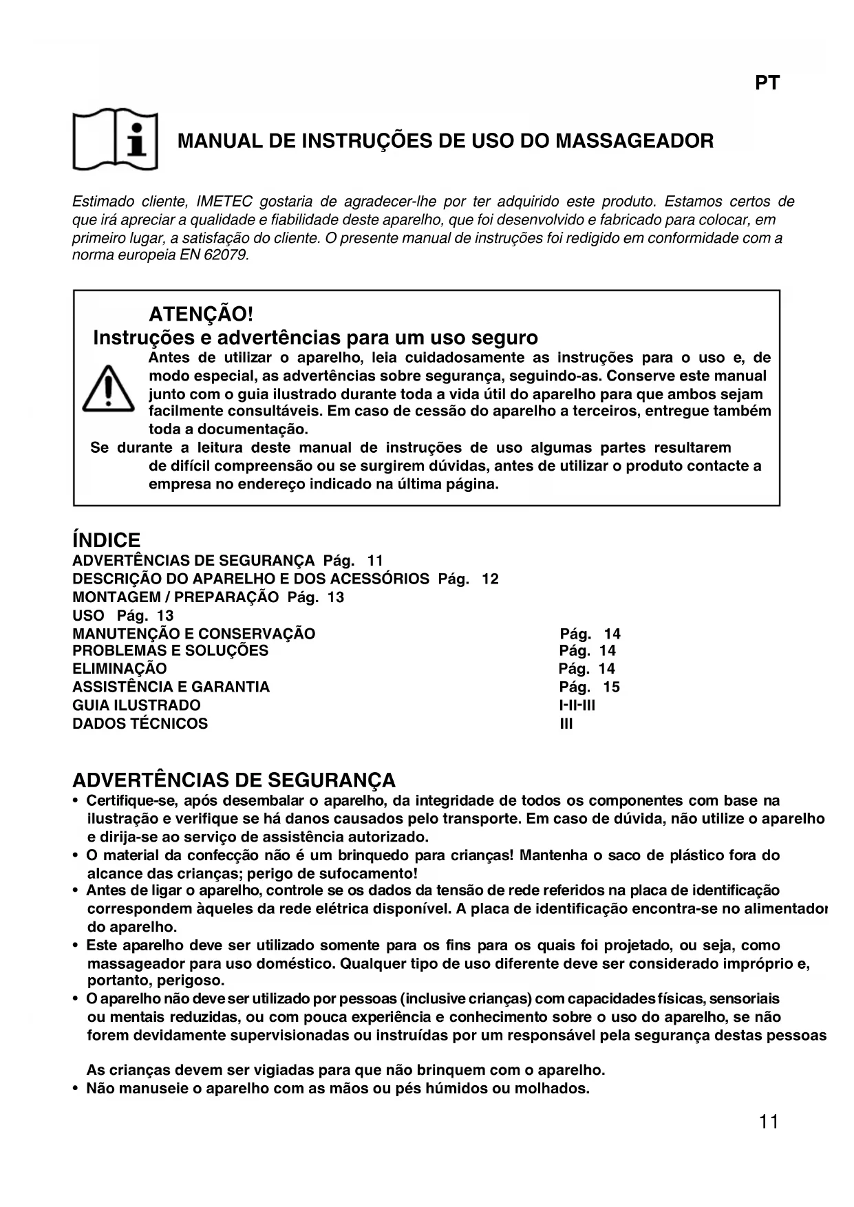 MANUAL DE INSTRUÇÕES DE USO DO MASSAGEADOR Estimado cliente, IMETEC gostaria de agradecer-lhe por ter adquirido este produto. Estamos certos de