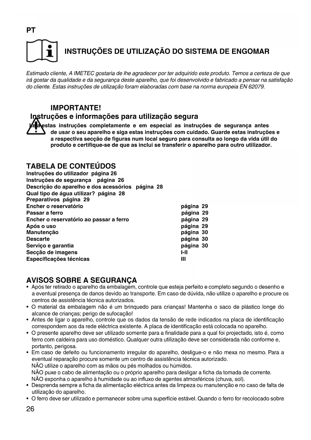 PT INSTRUÇÕES DE UTILIZAÇÃO DO SISTEMA DE ENGOMAR Estimado cliente, A IMETEC gostaria de lhe agradecer por ter adquirido este produto. Temos a certeza de que