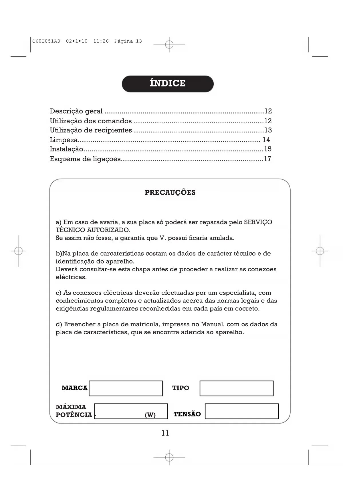 ESQUEMA ELECTRICO C60T051A3 02•1•10 11:26 Página 12ÍNDICE Descrição geral 12