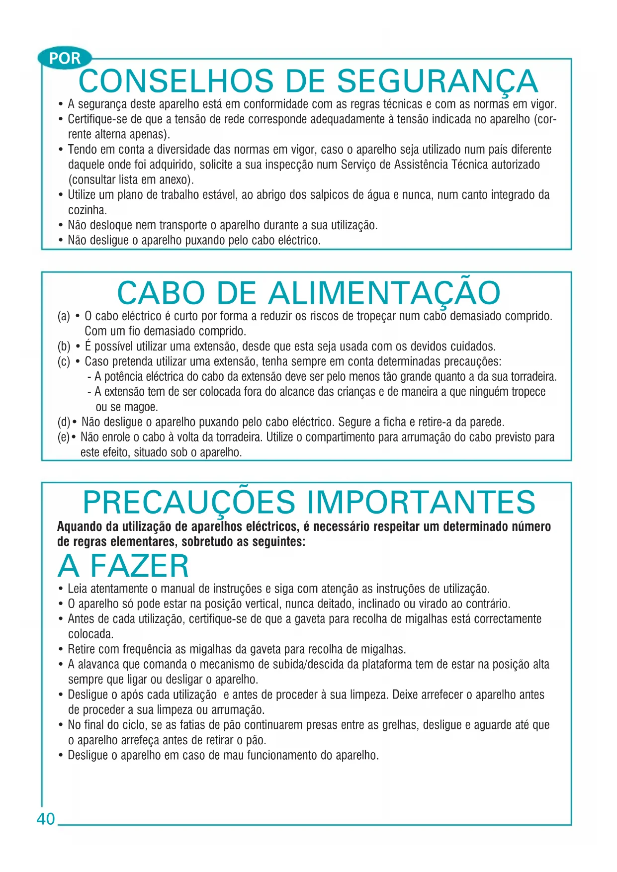 PRECAUÇÕES IMPORTANTES Aquando da utilização de aparelhos eléctricos, é necessário respeitar um determinado número